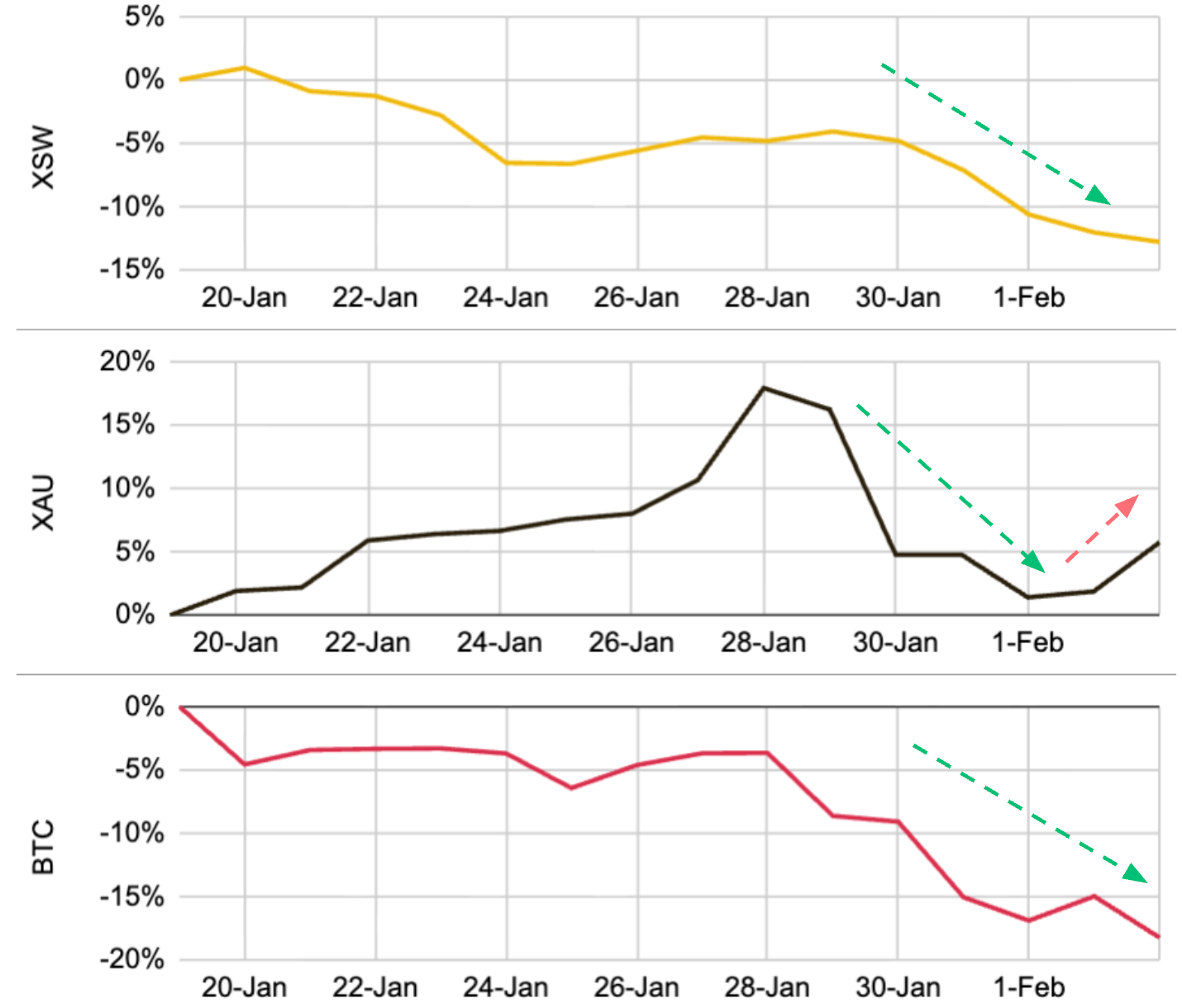 Quando as propostas de Warsh para reduzir o balanço patrimonial ameaçam a oferta de liquidez, as contas altamente alavancadas são as primeiras a receber chamadas de margem. Para levantar dinheiro, os investidores são forçados a vender seus ativos mais líquidos a qualquer custo. Isso inclui ações de grandes empresas de tecnologia, ouro e criptomoedas sem fluxo de caixa. O resultado são quedas generalizadas nos ativos.