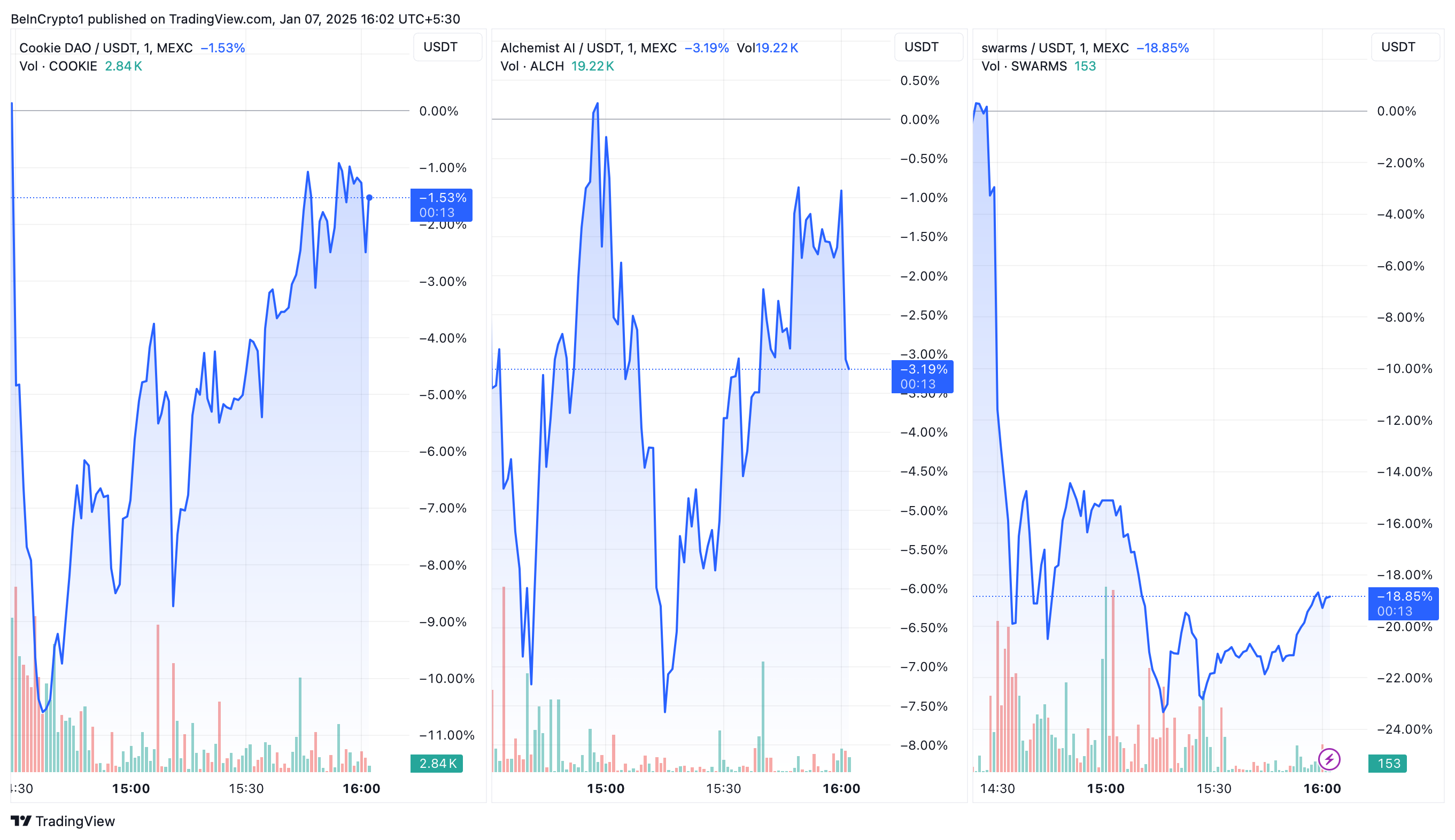 Logo após o anúncio da Binance, os preços dos três tokens oscilaram bastante. Alchemist e Cookie conseguiram se recuperar rapidamente, mas Swarms continuava em baixa no momento da publicação.