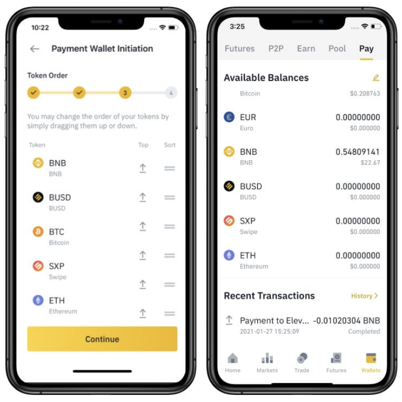Novos pagamentos, portanto, são deduzidos do saldo de acordo com a configuração da lista de tokens. Inicialmente, o aplicativo aceitará pagamentos em Bitcoin (BTC), Ethereum (ETH), Binance Coin (BNB), Binance USD (BUSD), Swipe Token (SXP) e Euro (EUR).