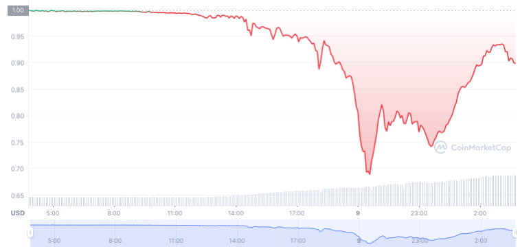 Nesse sentido, grandes quantidades de UST foram removidas do protocolo DeFi Curve Finance, fazendo com que a stablecoin perdesse sua paridade. No fechamento da matéria, a TerraUSD perdeu cerca de 10% de seu valor e está sendo negociado a US$ 0,90 depois de cair para US$ 0,69, de acordo com o CoinMarketCap.