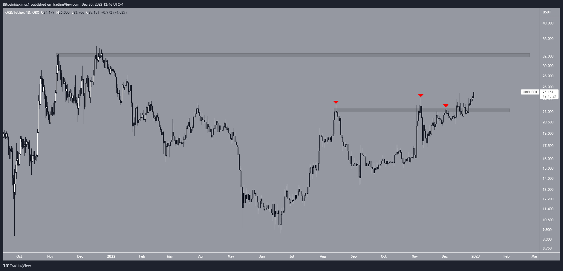 A OKB está subindo desde junho. Inicialmente, lutou para ultrapassar a área de resistência de US$ 22,50, fazendo três tentativas malsucedidas de rompimento (ícone vermelho). No entanto, o preço finalmente ultrapassou a resistência em 22 de dezembro e acelerou sua taxa de aumento.