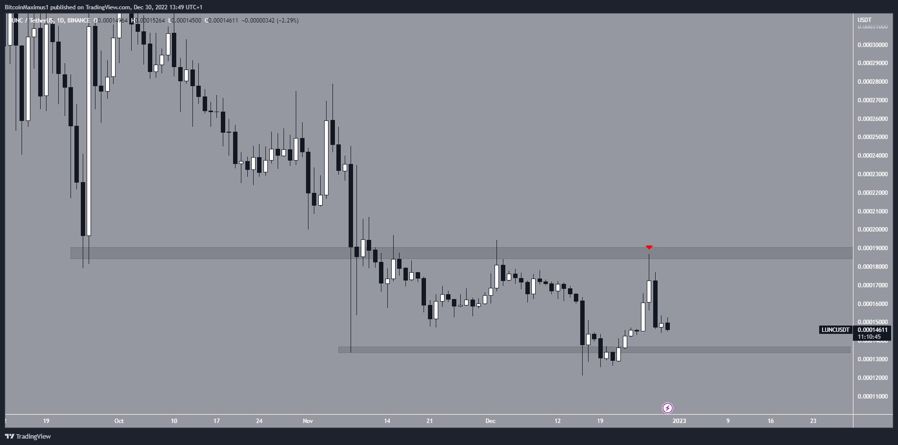 A LUNC iniciou um movimento de alta em 16 de dezembro, criando um longo pavio inferior (ícone verde). O salto levou a uma alta de US$ 0,00018 em 27 de dezembro. No entanto, o token não conseguiu ultrapassar a área de resistência de US$ 0,000185 e voltou a cair.