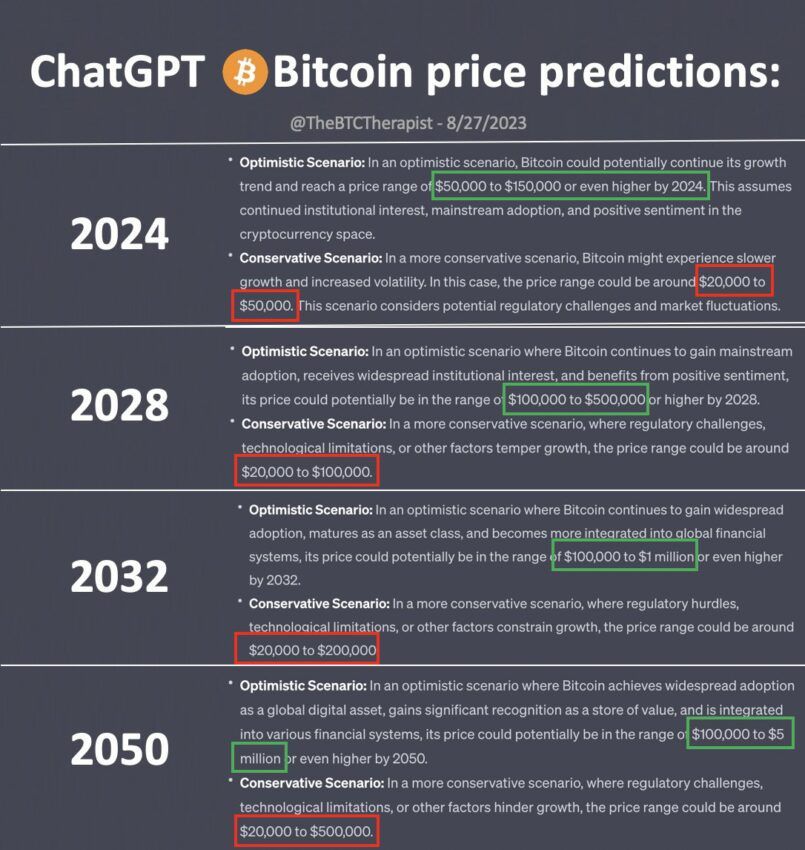 Membros da comunidade cripto pediram ao chatbot da OpenAI uma previsão do preço do Bitcoin para estes anos.