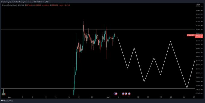 Um analista do mercado de criptomoedas conhecido como “Crypto Tony” mencionou recentemente no Twitter que, se o Bitcoin não ultrapassar o nível de resistência de US$ 31.000 esta semana, poderá sofrer uma queda temporária para US$ 28.000.