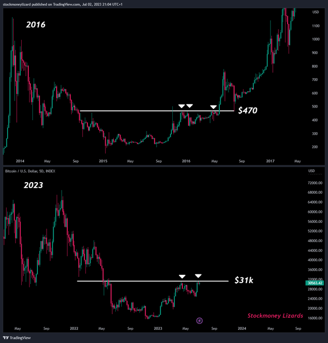 Por outro lado, “Stockmoney Lizards” observou que quanto mais vezes uma linha de resistência é testada, mais fraca ela fica. O analista deu o exemplo de 2016. Naquela época, o preço do BTC testou repetidamente a linha de resistência de US$ 470, até que finalmente conseguiu rompê-la.