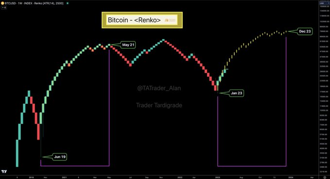 De sua parte, o “Trader Tardigrade” observou que o gráfico Renko do BTC, que é baseado em movimentos de preços em vez de prazos fixos como a maioria dos gráficos, segue padrões semelhantes aos observados em 2019-2021.