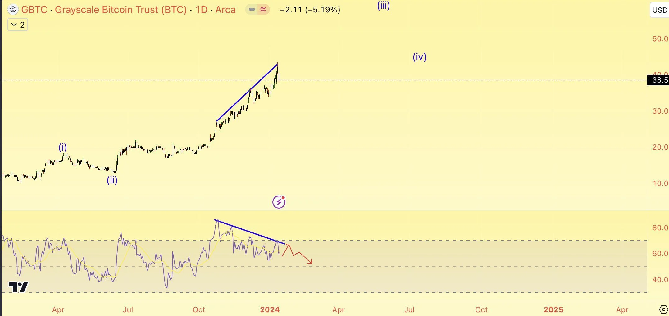 Mesmo estando acima de 50, o Índice de Força Relativa (RSI) semanal está caindo, gerando uma divergência de baixa (verde).