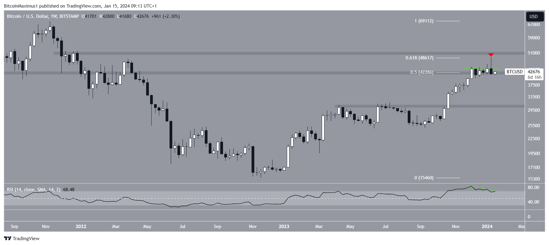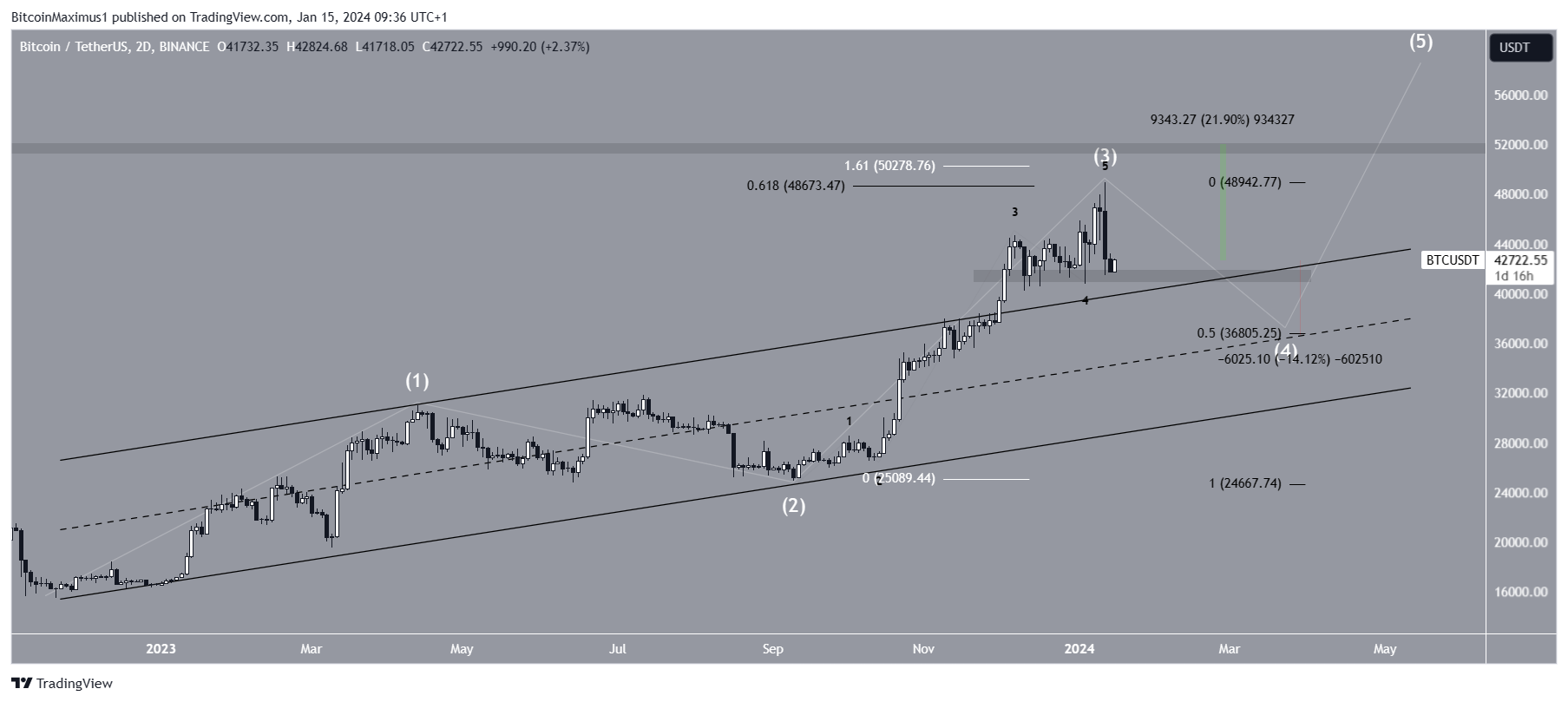 O movimento levou a uma máxima de US$ 49.000 em 11 de janeiro, um dia após a aprovação dos ETF à vista. Isso causou um rompimento acima de uma importante área de resistência horizontal e de Fibonacci.