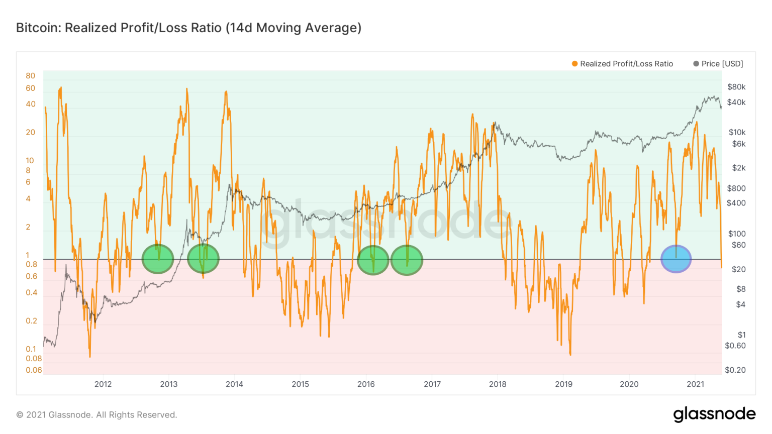 Finalmente, o terceiro exemplo do padrão de análise on-chain é a média de 14 dias do Índice de Lucro/Perda Realizado. É a relação entre todas as moedas movimentadas com lucro e prejuízo.