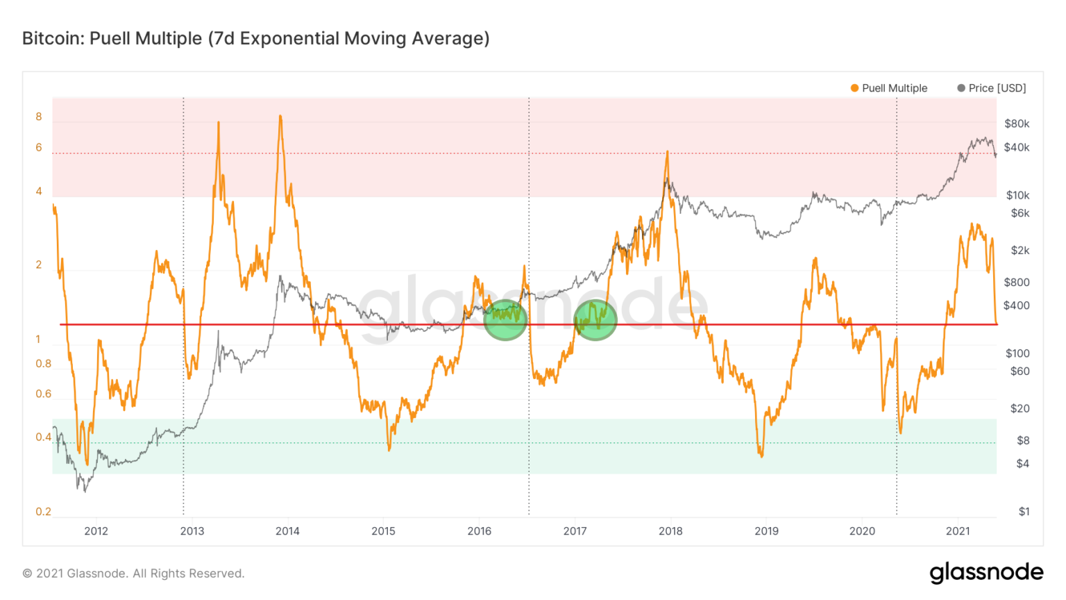 Finalmente, o último elemento da análise que fornece argumentos para o meio do rali atual é o famoso Múltiplo de Puell. Ele é calculado dividindo o valor de emissão diária de Bitcoin pela média móvel de 365 dias deste valor.