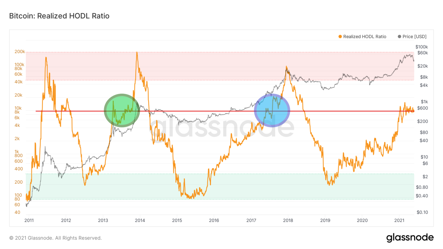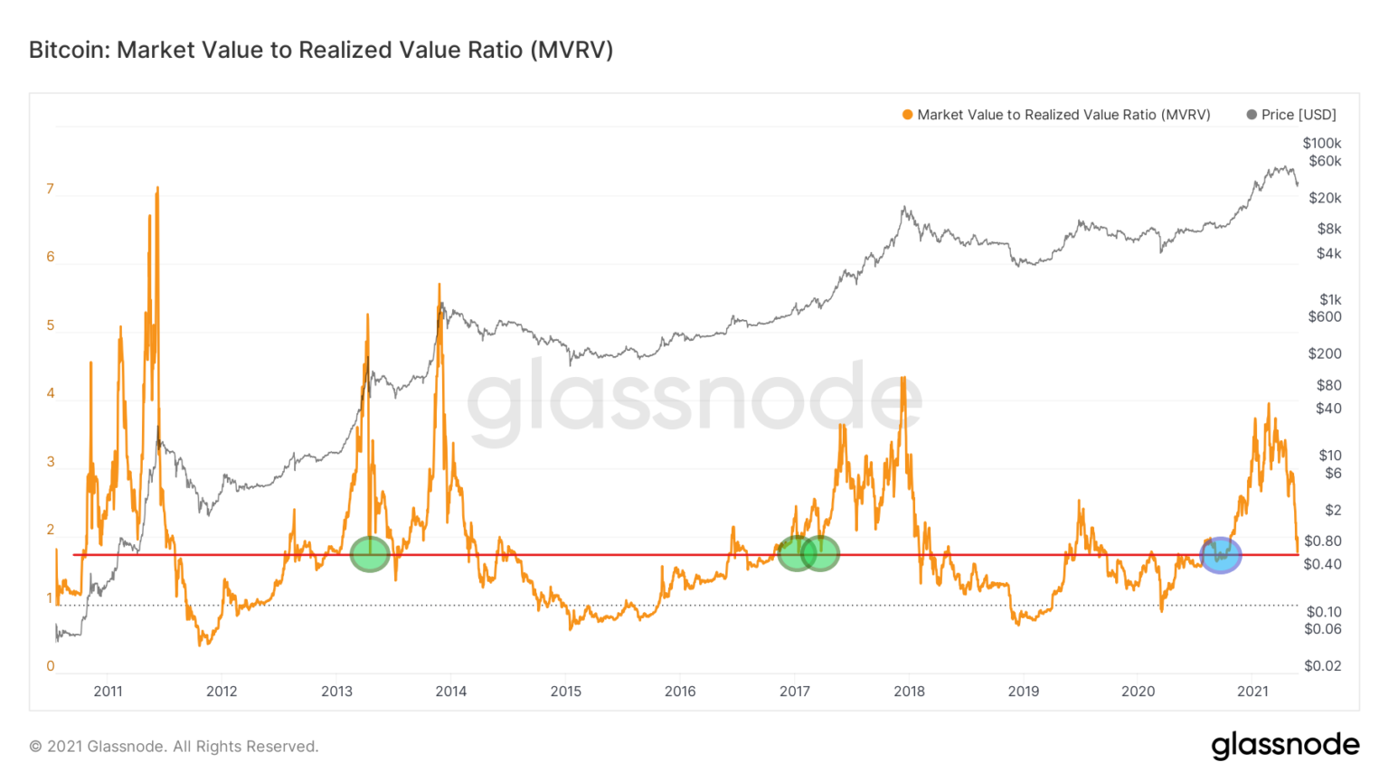 Durante a atual correção, o MVRV aproximou-se do valor de 1,8, onde caiu durante as correções dos ciclos anteriores (círculos verdes). Em ambos os casos, ocorreu um retorno do mercado de alta, seguido por uma fase exponencial de crescimento.