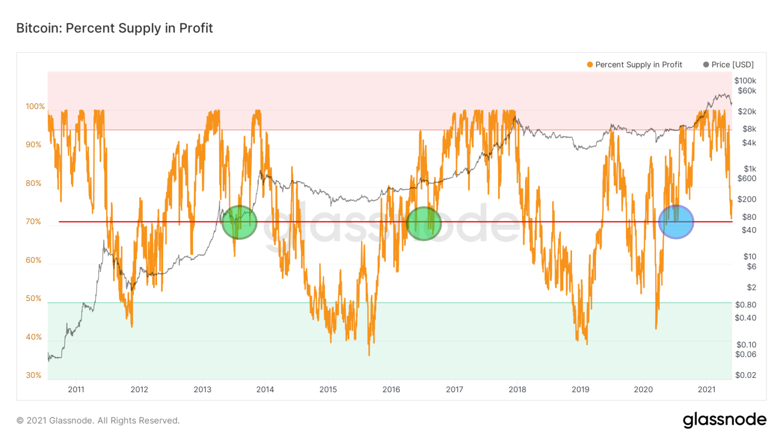 Atualmente, cerca de 72% do Bitcoin possui lucro em comparação com o preço pelo qual foram comprados. Este valor foi atingido várias vezes após o primeiro pico local em 2013. Também se manteve duas vezes como suporte após correções entre maio e agosto de 2016 (círculos verdes).