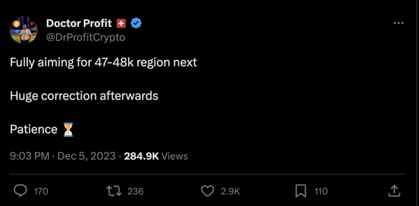 A sua previsão pressupõe a primeira correção significativa, estimada em 20-30%. O analista argumenta que haverá uma correção significativa depois que o Bitcoin atingir os níveis de US$ 47.000 a US$ 48.000.