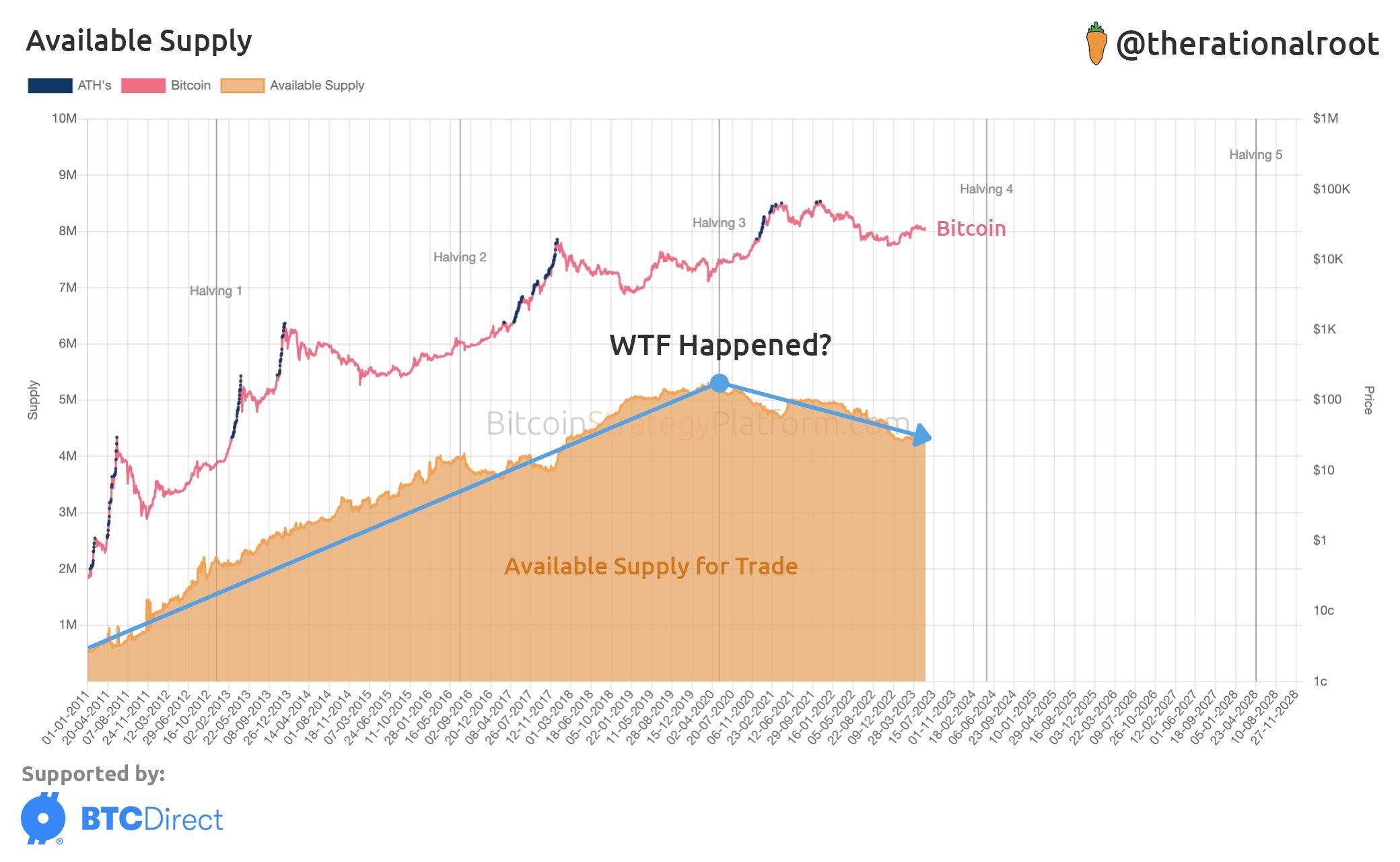 No domingo (25), o analista on-chain “@therationalroot” informou que a oferta disponível para negociação diminuiu desde o terceiro halving em maio de 2020.