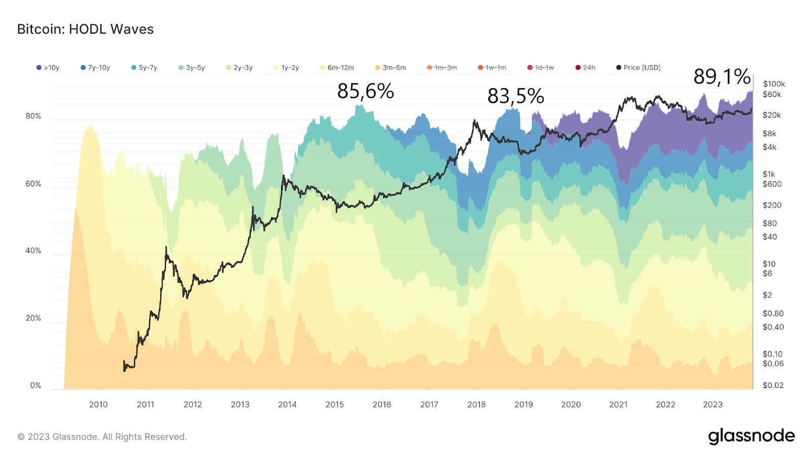 No gráfico das bandas dos detentores de longo prazo – do amarelo ao roxo – vemos uma nova máxima histórica (ATH). Atualmente, até 89,1% da oferta de BTC não está se movendo, não é negociada e não muda de mãos.