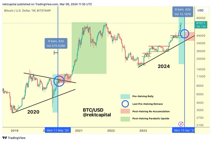 Durante o ciclo anterior, o evento ocorreu em maio de 2020 e selou seu – agora anterior – recorde histórico 18 meses depois. Nesse sentido, o analista e trader de criptomoedas, Michaël van de Poppe explicou no X: