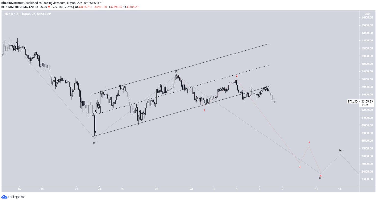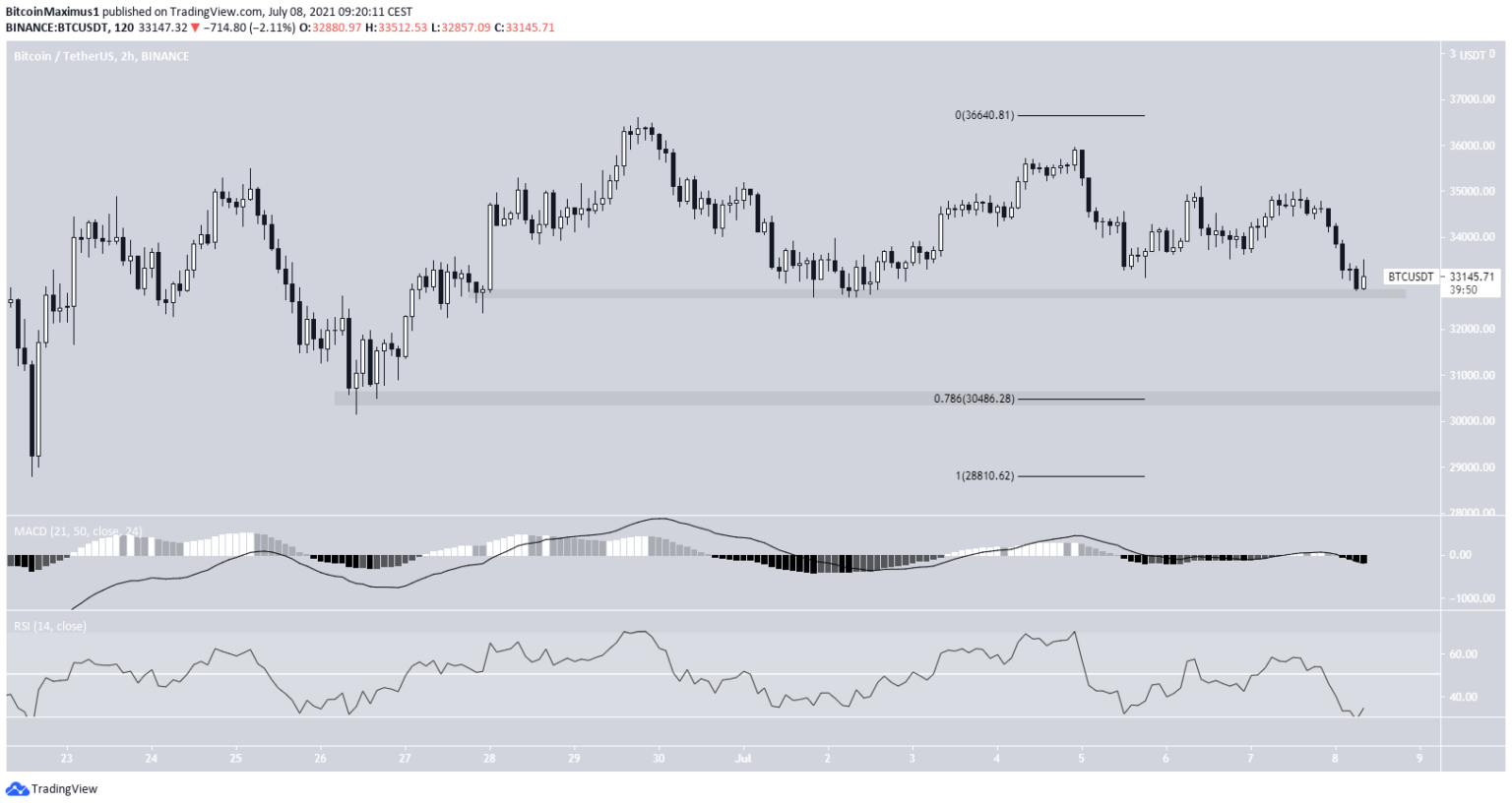 O BTC tem sido negociado desde 21 de junho entre US$ 31.300 e US$ 40.550. O preço atual é um nível previsto pela retração de Fibonacci, e também funciona como um suporte horizontal, o que sinaliza certa solidez por enquanto. No entanto, se o BTC cair, deverá ir diretamente para US$ 30.500.