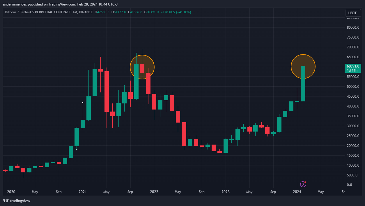 Como é possível ver no gráfico mensal, o BTC terá caminho livre rumo a um novo preço recorde se conseguir fechar o mês de fevereiro acima da marca de US$ 60.000.