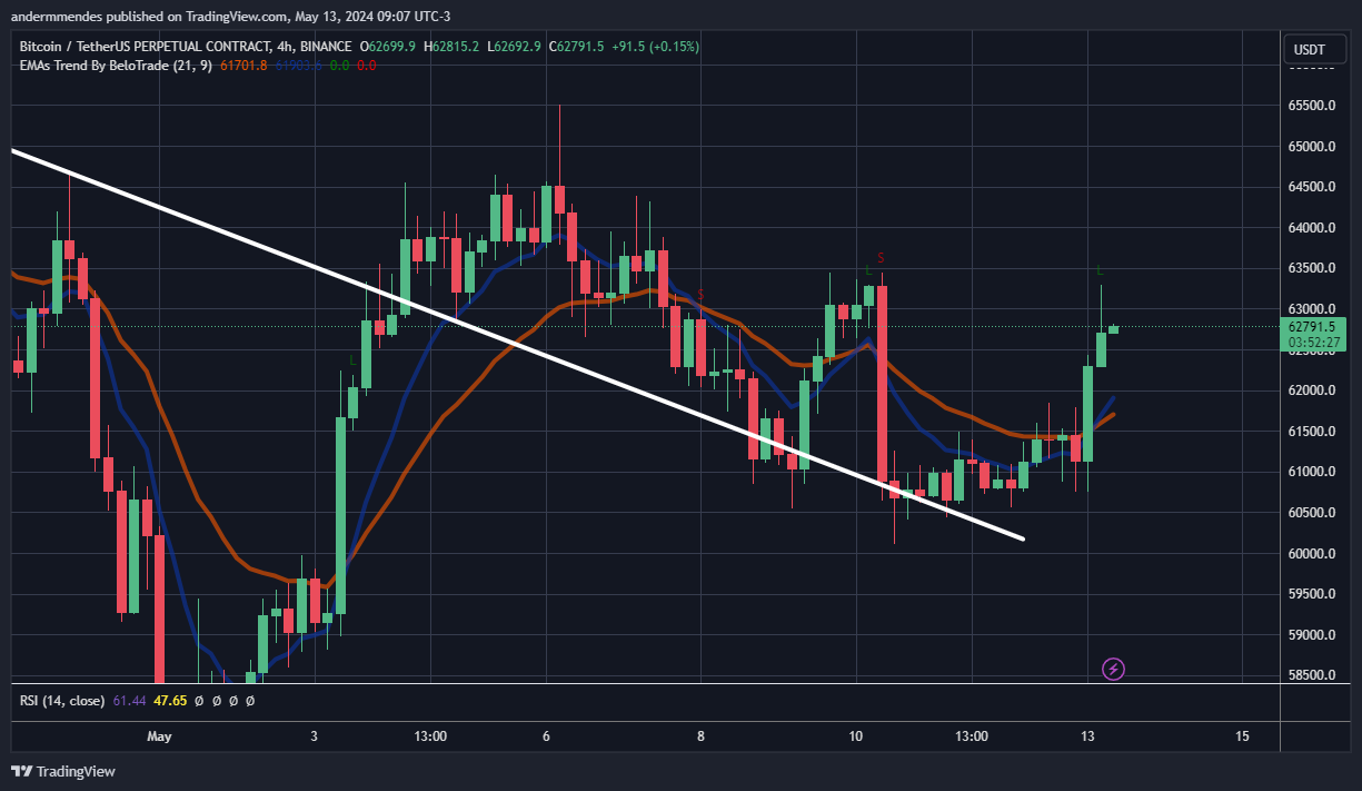 Nesse caso, o preço poderia cair para testar a linha de resistência do canal novamente, próximo a US$ 60.000. Por outro lado, seguir em alta pode fazer o Bitcoin subir para US$ 64.500.