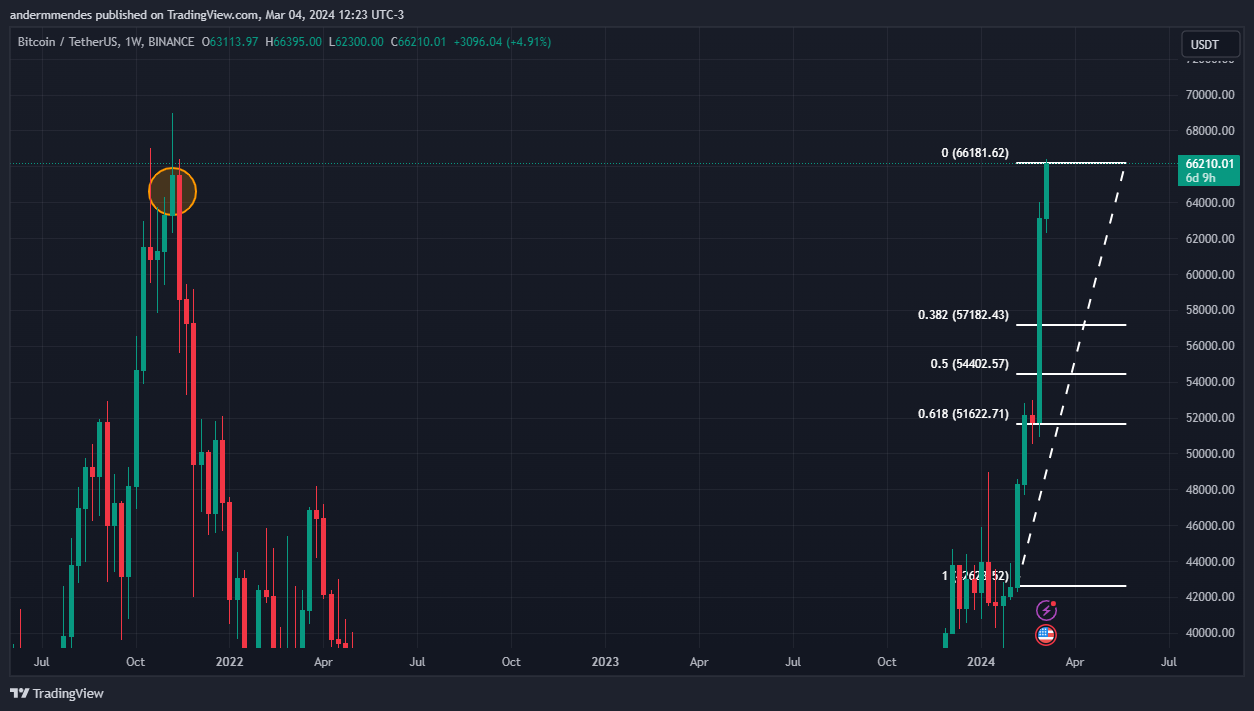 Se fechar o candle semanal atual, que se encerra no próximo domingo (10), acima de US$ 66.000, o BTC terá teoricamente um caminho livre para atingir tal feito. Isso porque a sua última resistência antes do seu topo histórico está em US$ 65.600 (círculo laranja).