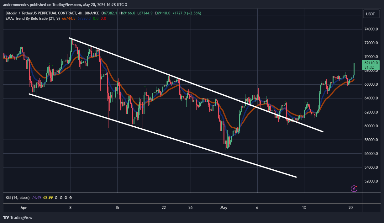 Portanto, o BTC tem agora caminho livre até o seu próximo topo, em US$ 71.070. Se conseguir romper essa zona de preço, o ativo pode subir até o topo que deu início a cunha de baixa, em US$ 72.800.
