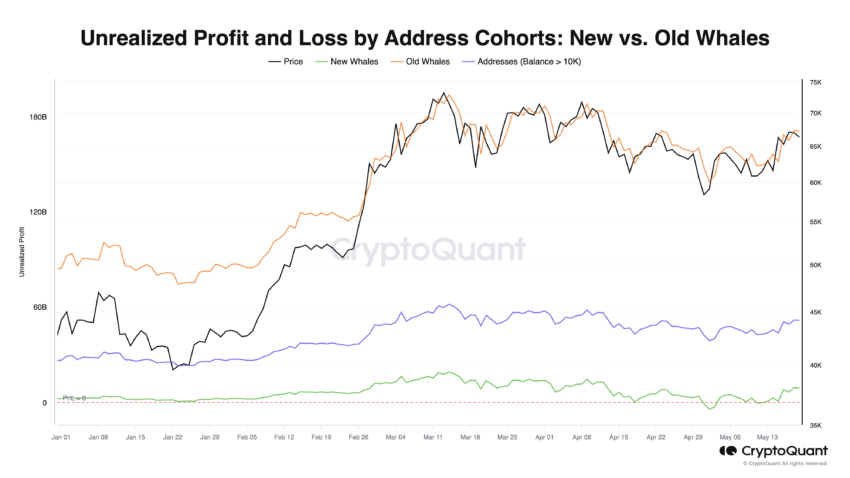 A capitalização realizada, que mostra quanto dinheiro foi investido em Bitcoin considerando os preços históricos pelos quais cada moeda foram adquiridas, tem mostrado dados interessantes sobre as baleias da rede. Desde janeiro, a métrica para novas baleias tem aumentado constantemente, indicando o acúmulo ativo de BTC por esses novos grandes investidores.