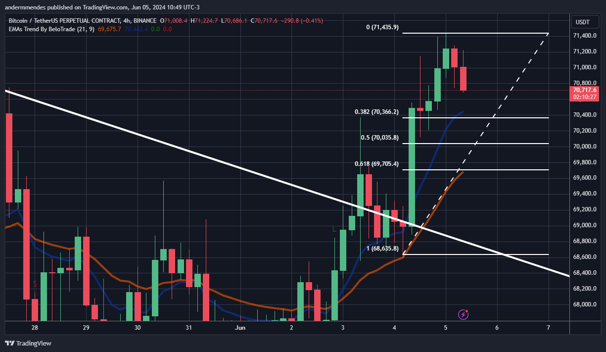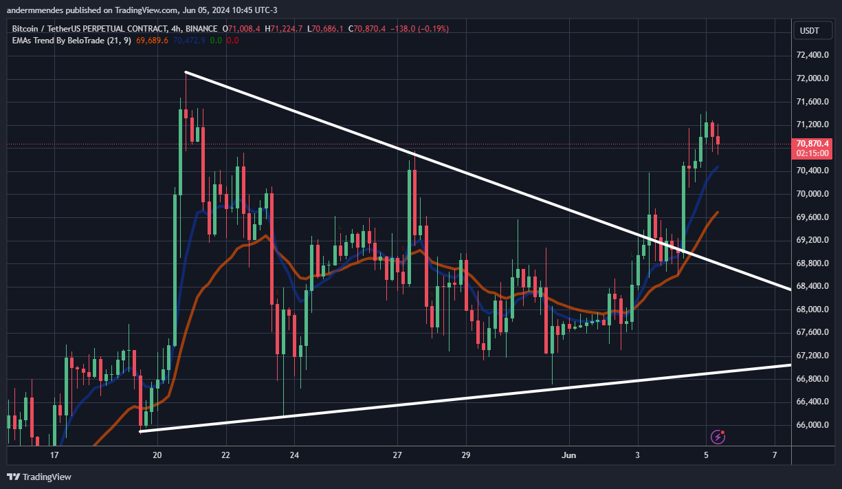 Portanto, mesmo que o Bitcoin siga em queda até US$ 69.700, a tendência ainda é considerada de alta. Dessa forma, o ativo possui grandes chances de subir até o início da formação do triângulo simétrico, em US$ 72.100.