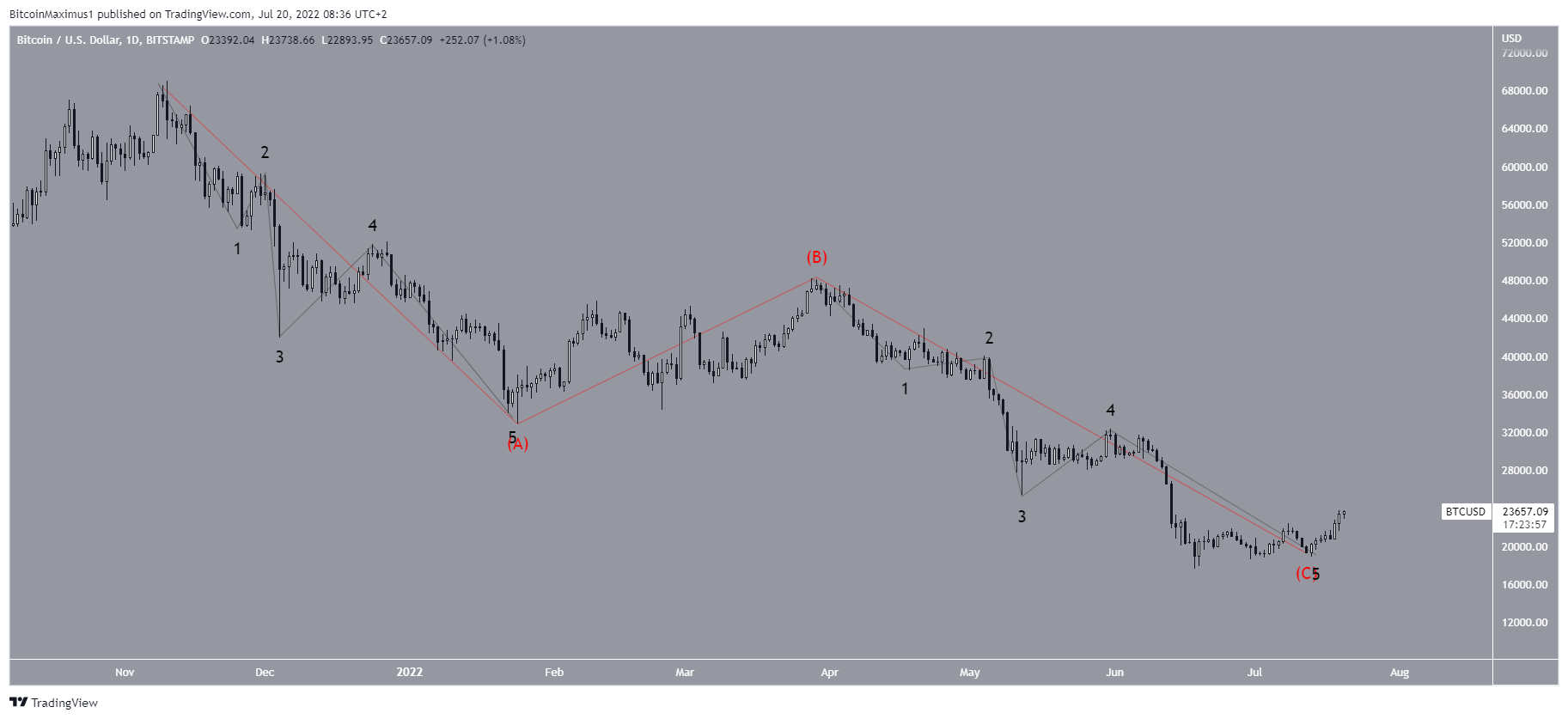 Quanto à contagem de ondas de longo prazo, parece que o BTC completou uma estrutura corretiva A-B-C ao medir o movimento desde a sua máxima histórica de preço. Portanto, é possível que um movimento significativo de alta ocorra agora.