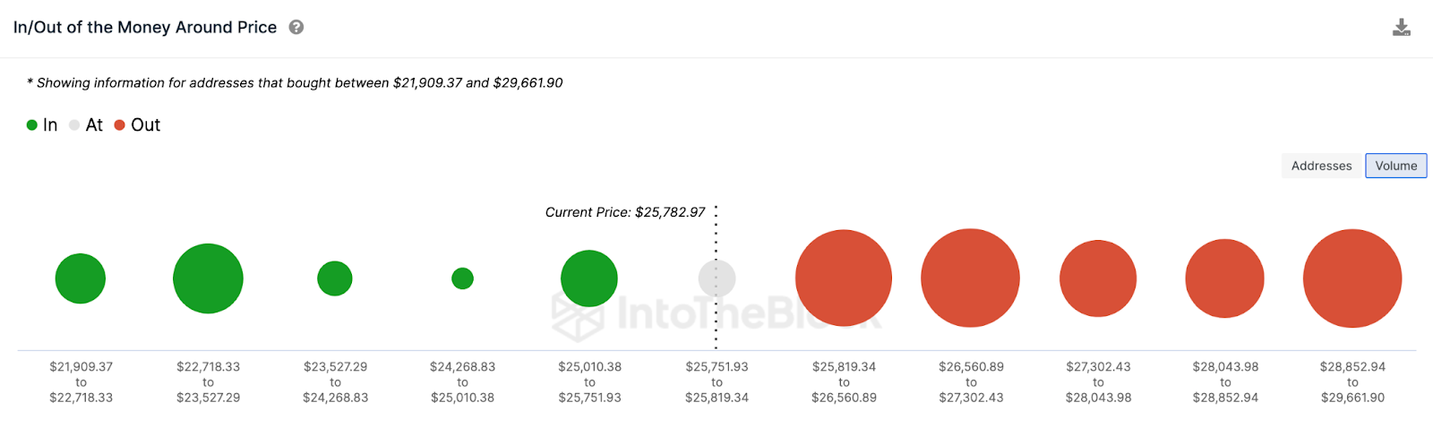 Do ponto de vista da rede, as baleias baseadas nos EUA podem desencadear uma alta do preço do Bitcoin em direção a US$ 28.000 nos próximos dias. Esta postura de alta também é validada pelos dados do In/Out of Money Around Price, que retratam a distribuição do preço de compra dos detentores de Bitcoin.