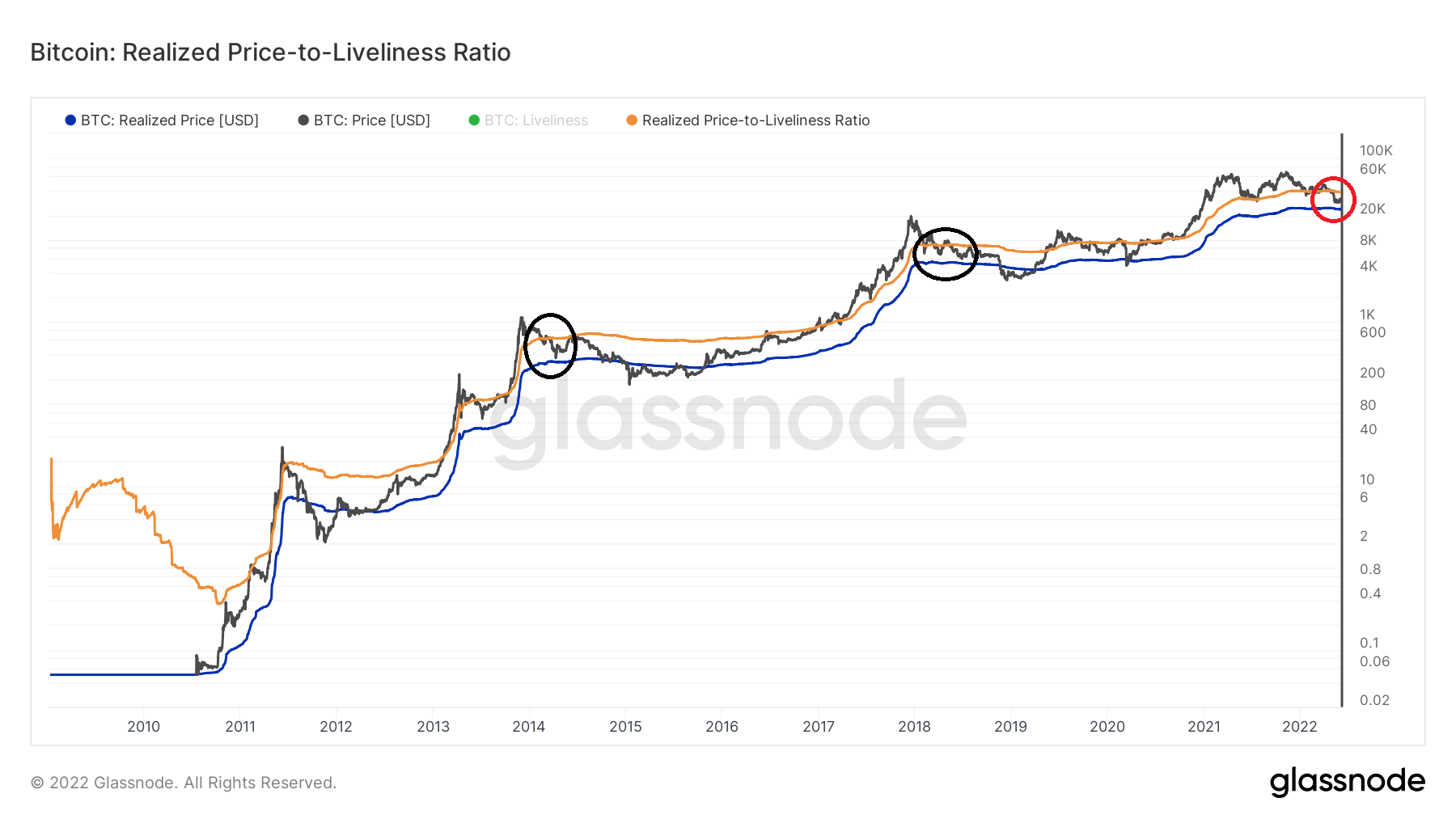 Historicamente, o preço do BTC subiu várias vezes acima do RPLR (laranja). Uma vez que o BTC se move decisivamente acima dessa linha, a primeira quebra decisiva subsequente marca o fim do ciclo de alta. Este foi o caso em 2014 e 2018 (círculos pretos).