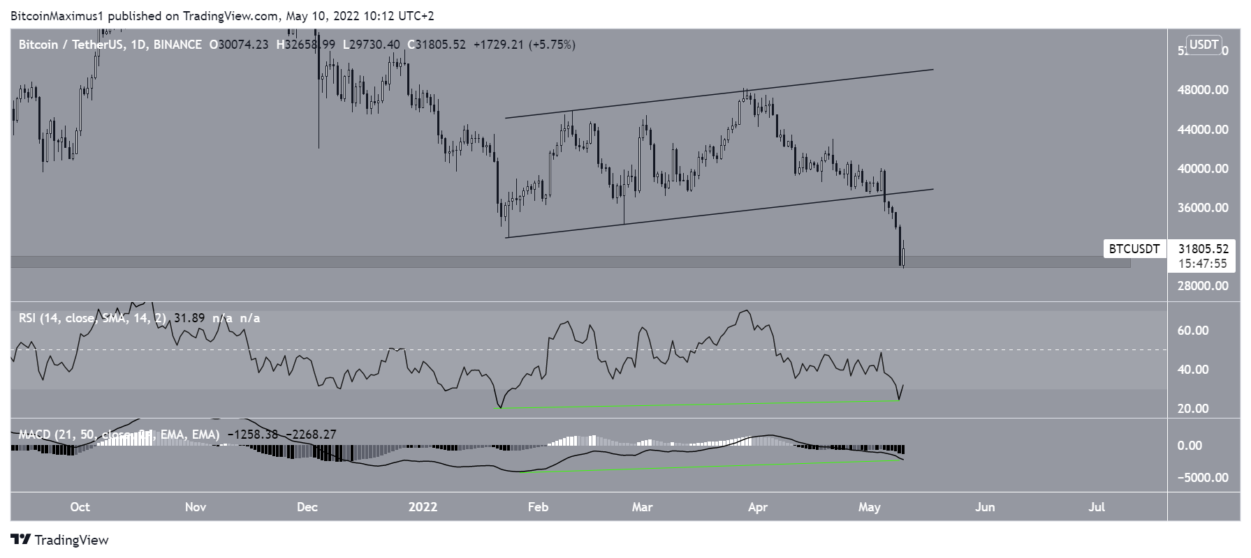 Na manhã desta terça-feira (10), o BTC atingiu um fundo em US$ 29.730 e se recuperou depois, validando a área horizontal de US$ 30.500 como suporte. Esta área não é testada desde julho de 2021.