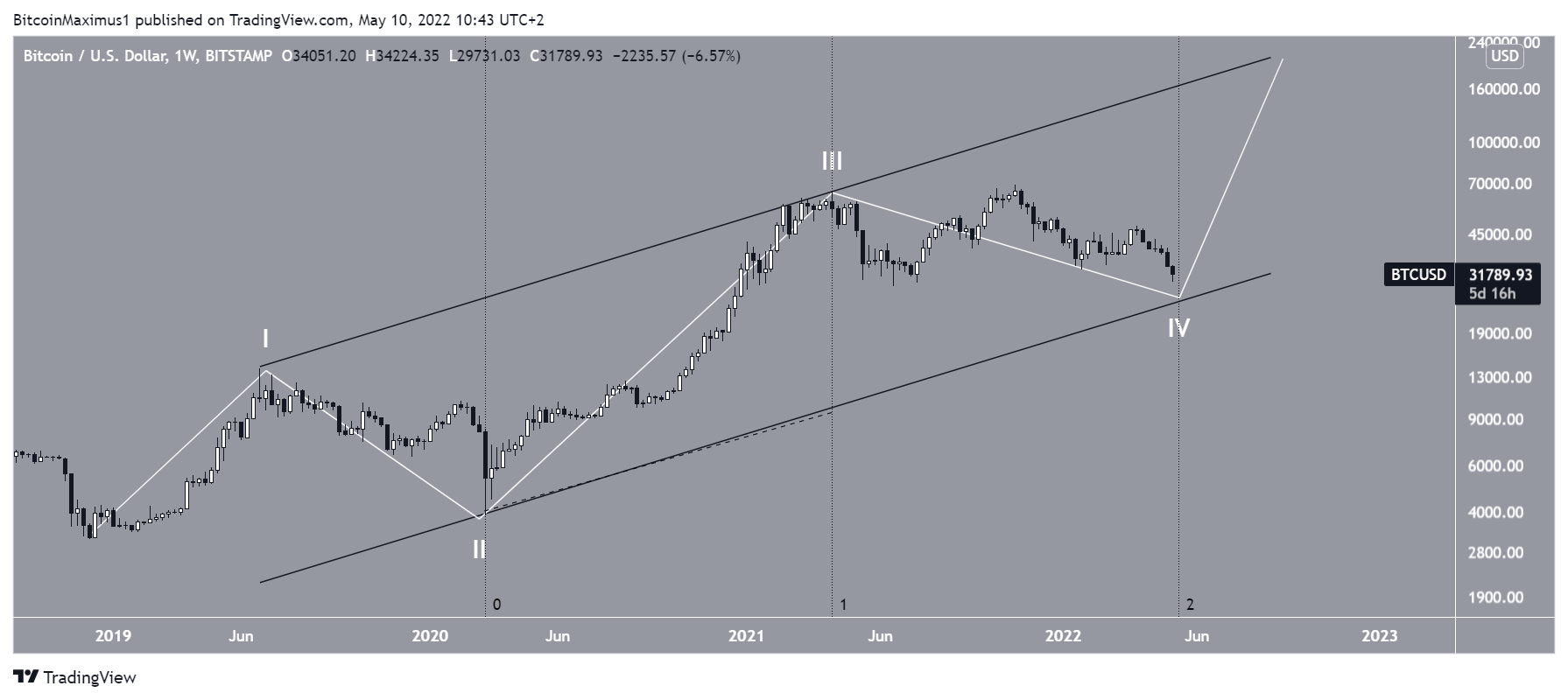 A contagem de ondas de longo prazo ainda sugere que o movimento de queda contínua faz parte da onda quatro (branca) de um movimento de alta de cinco ondas que começou em dezembro de 2018.