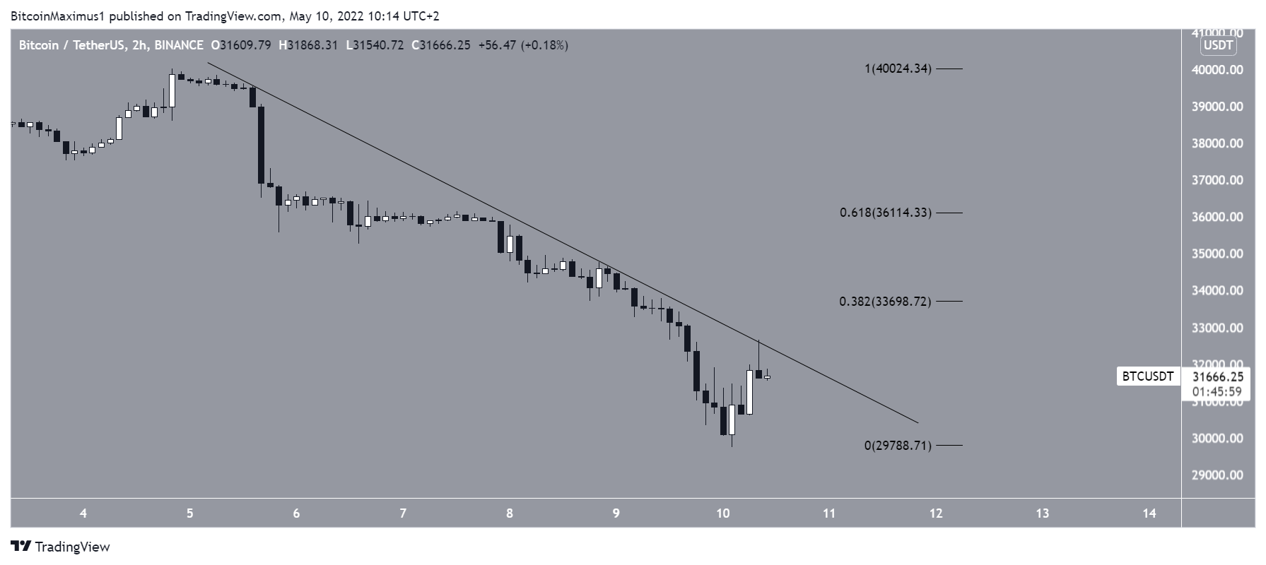 Já o gráfico de duas horas mostra que o BTC está sendo negociado abaixo de uma linha de tendência de baixa desde a última quinta-feira.