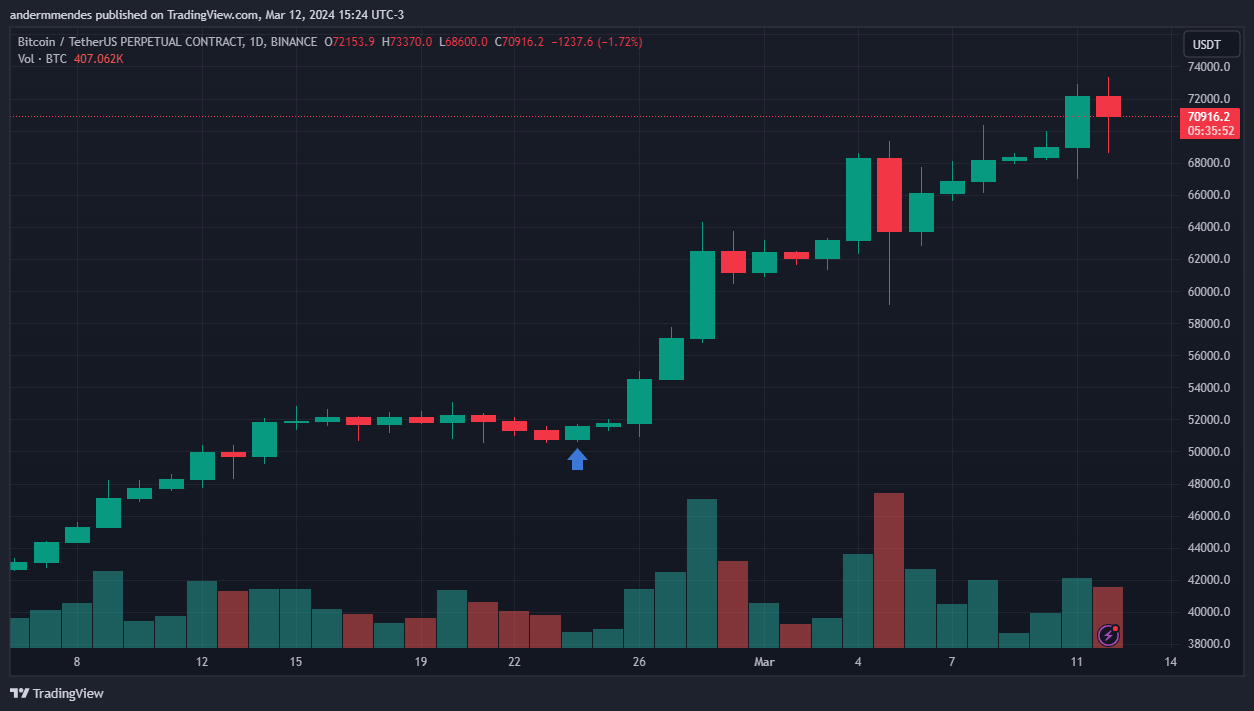 O gráfico diário mostra que o Bitcoin chegou a subir 45% desde que iniciou seu atual movimento de alta, em 24 de fevereiro (seta azul).