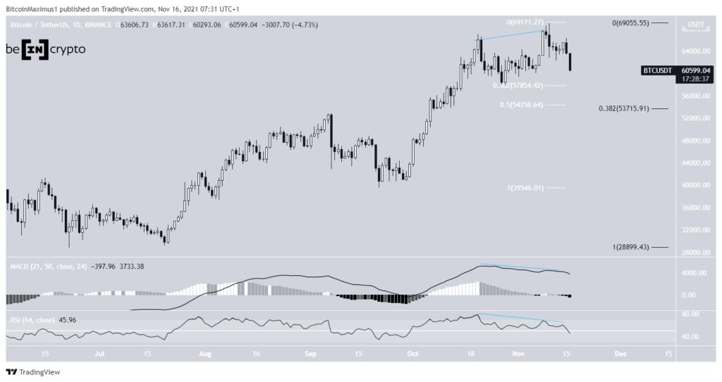 O Bitcoin está em tendência de baixa desde que atingiu a máxima histórica de US$ 69.000 na última quarta-feira (10). O movimento foi seguido por divergências de baixa no MACD e no RSI. Essas divergências geralmente precedem as reversões da tendência de baixa.