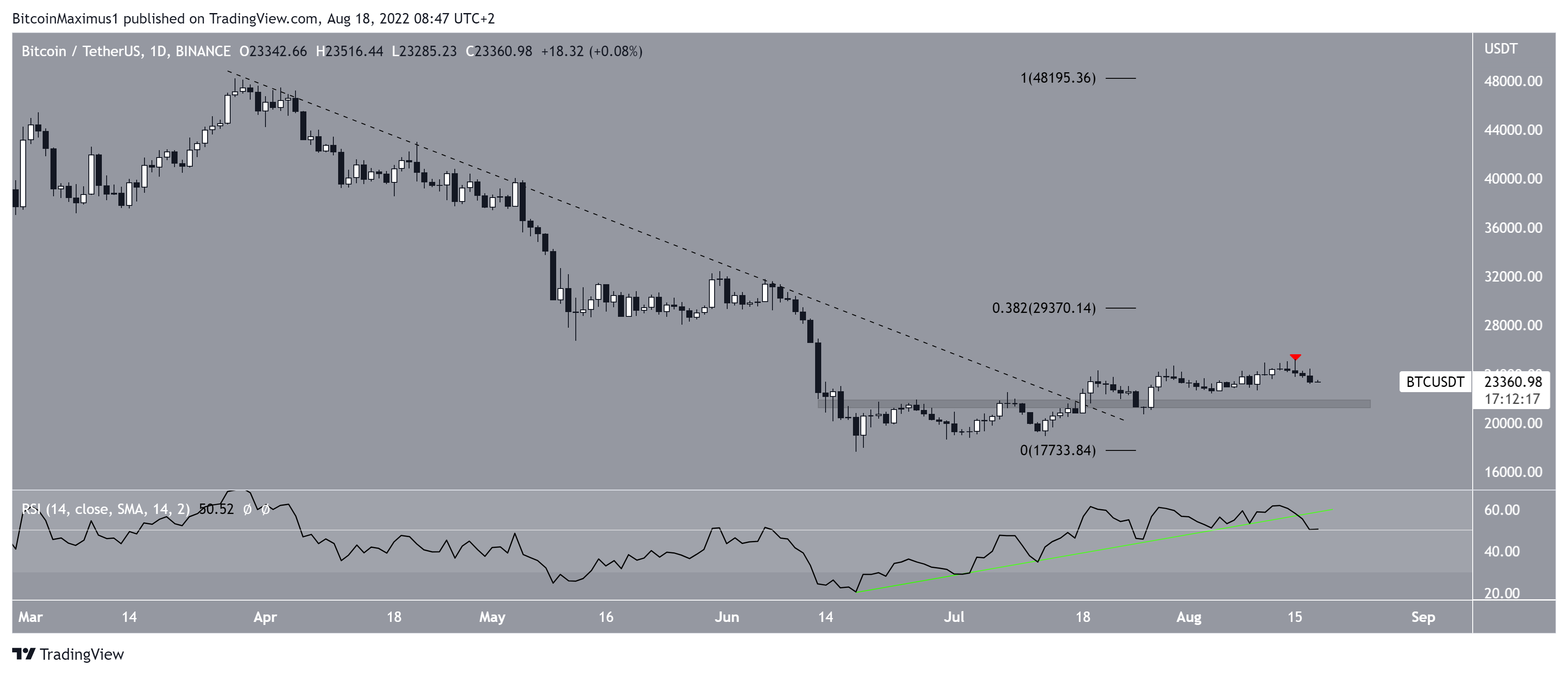 O preço do BTC estava subindo desde 18 de junho. Em 18 de julho, o ativo rompeu acima de uma linha de tendência de baixa em vigor desde o final de março.
