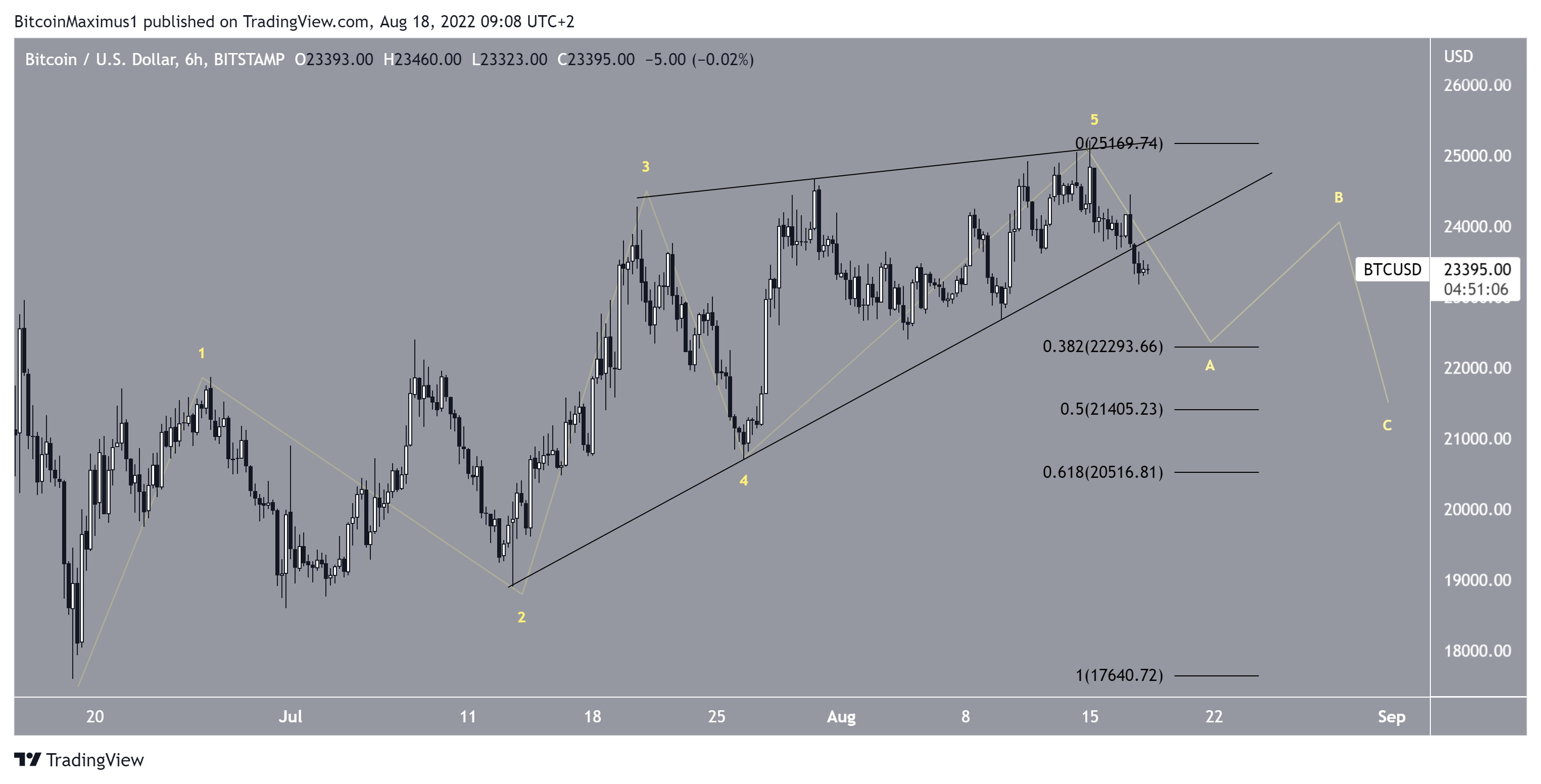 Devido à queda contínua, a contagem de ondas primárias agora sugere que o Bitcoin completou a onda cinco de uma diagonal principal, criando assim uma cunha de alta. A quebra da cunha sugere que isso é parte da onda A de uma estrutura corretiva A-B-C.