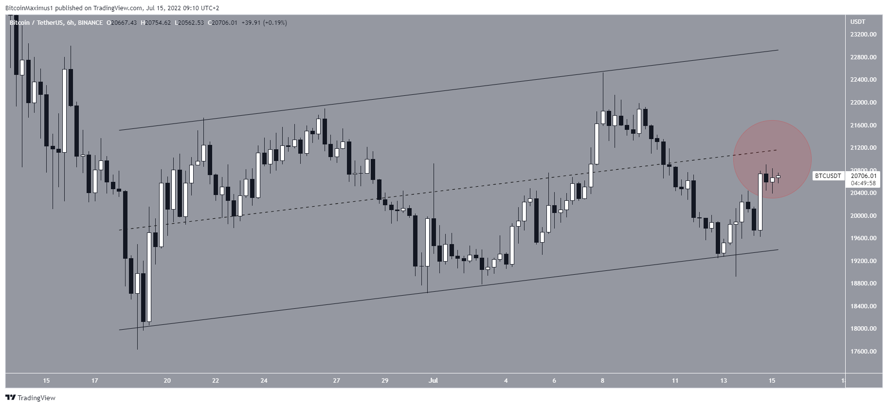O gráfico de seis horas mostra que o preço do Bitcoin está se movendo dentro de um canal paralelo de alta desde 18 de junho. Esses canais geralmente contêm movimentos corretivos, sugerindo que um eventual rompimento é provável.