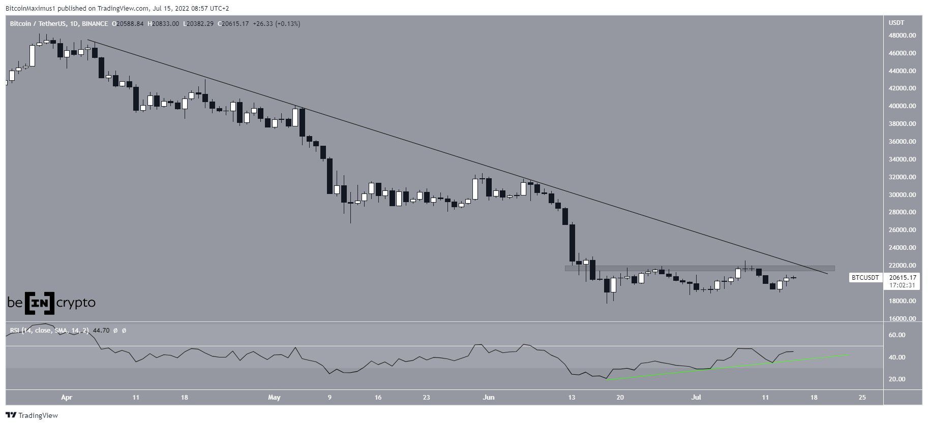 O preço do ativo vem subindo desde então, mas ainda não atingiu essa linha de tendência de baixa, que atualmente é encontrada perto de US$ 21.700. Agora, a linha também coincide com a área de resistência horizontal de US$ 21.700, que foi alcançada duas vezes recentemente. Ambas as vezes, esta linha causou uma queda de preço.