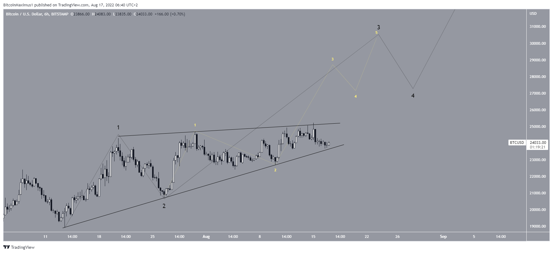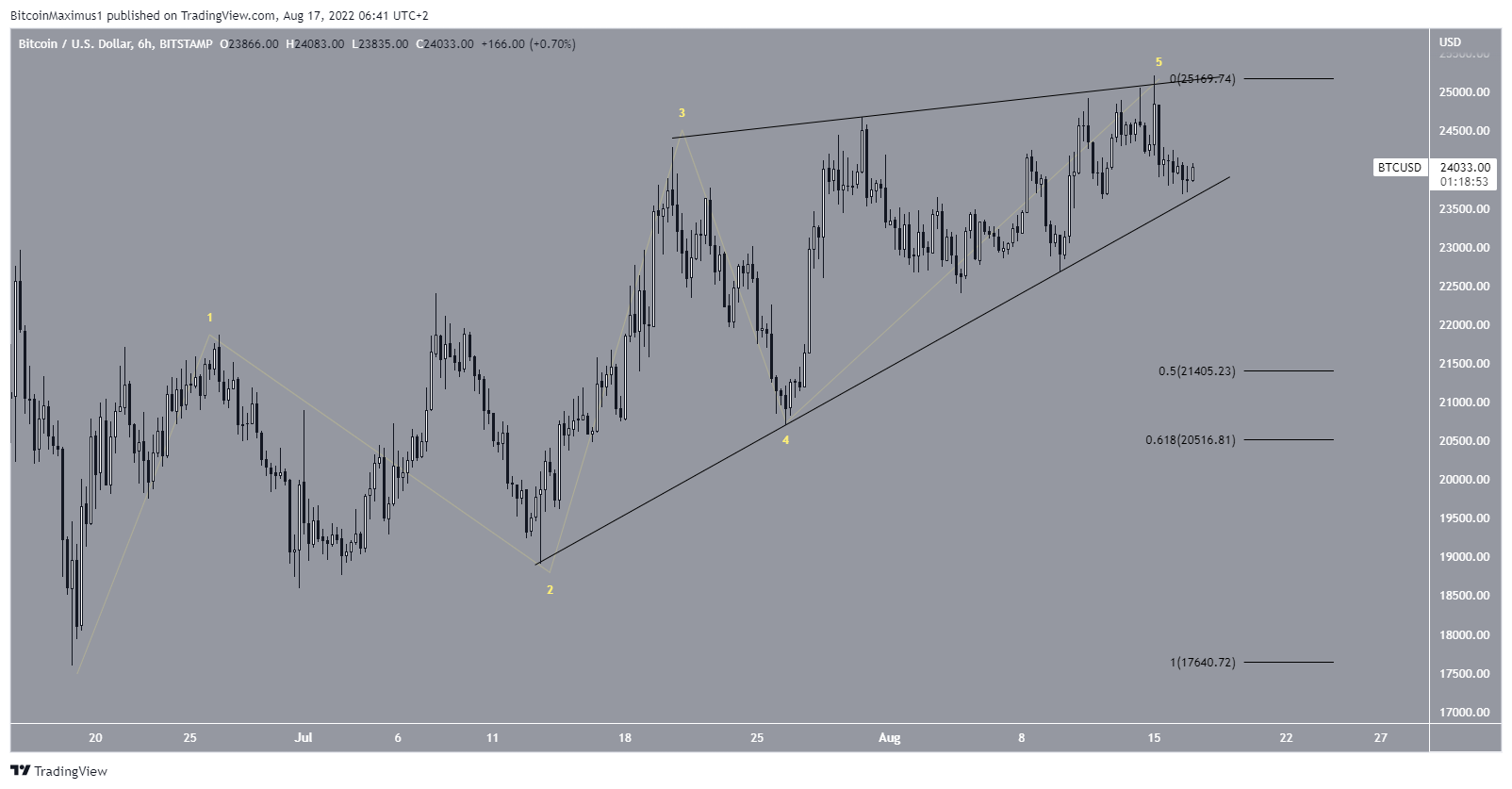 A segunda contagem de curto prazo sugere que o Bitcoin completou a onda cinco de uma diagonal principal, moldando assim a cunha de alta. Nesse caso, seria esperado um rompimento da cunha e uma queda subsequente para os níveis de retração de 0,5-0,618 entre US$ 20.500 e US$ 21.400 antes da continuação do movimento de alta.
