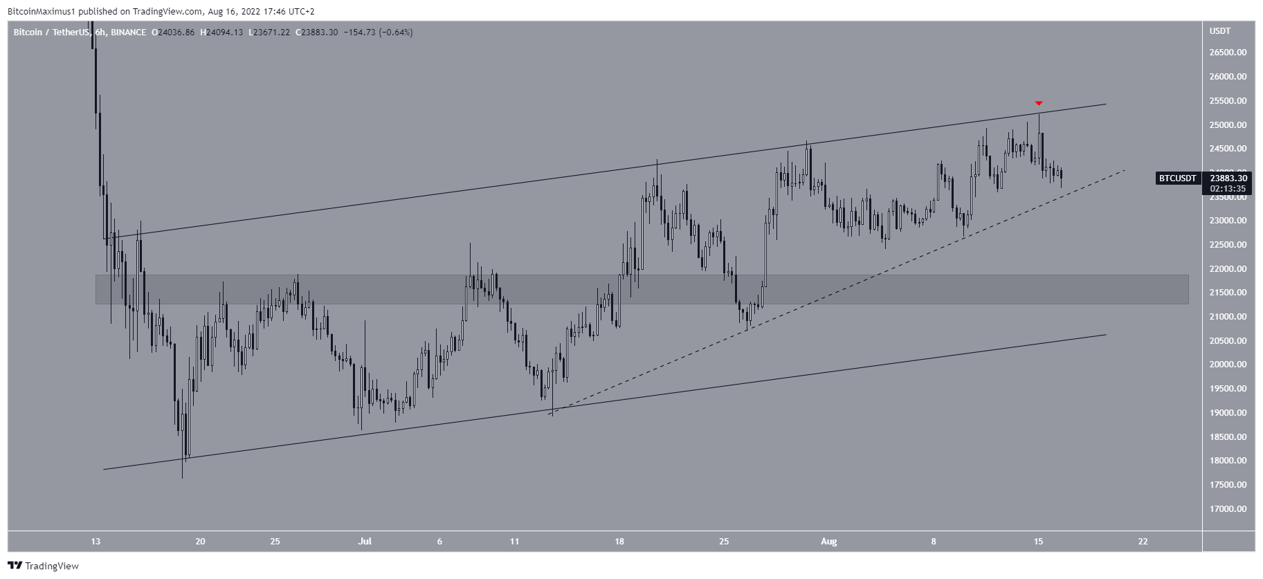 O gráfico de seis horas mostra que o Bitcoin está sendo negociado dentro de um canal paralelo de alta desde que atingiu a mínima de preço em 18 de junho. Esses canais geralmente contêm movimentos corretivos, o que significa que um eventual rompimento seria esperado.
