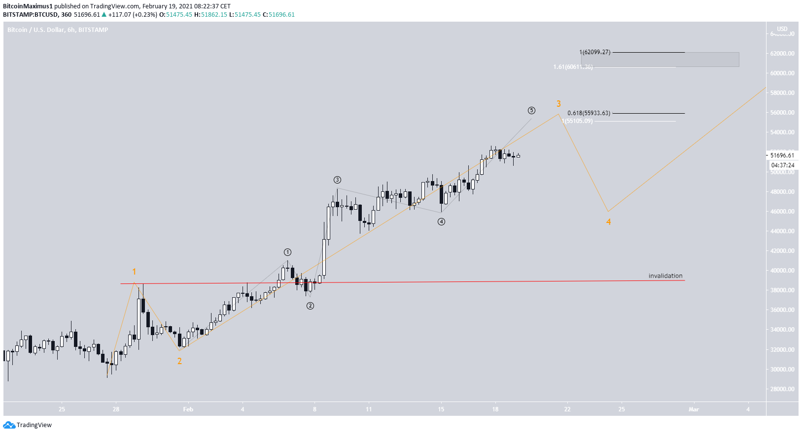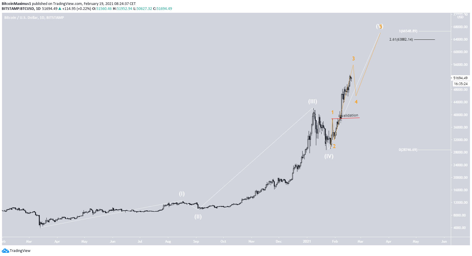 A contagem de ondas sugere que o BTC quase atingiu o topo da onda três (laranja). A onda é parte de um impulso de alta que começou no dia 27 de janeiro de 2021.