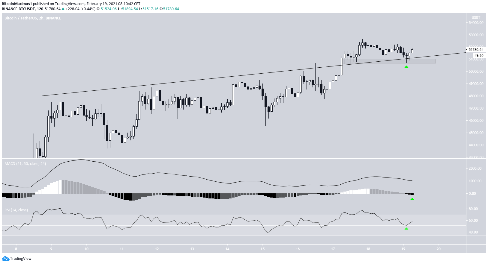 Depois de atingir um máximo de $ 52.640, o BTC retornou e validou a linha de resistência ascendente anterior (seta verde). Este nível agora provavelmente funcionará como suporte. O novo teste também coincide com um salto do RSI em 50 – um sinal de que o BTC está pronto para subir.