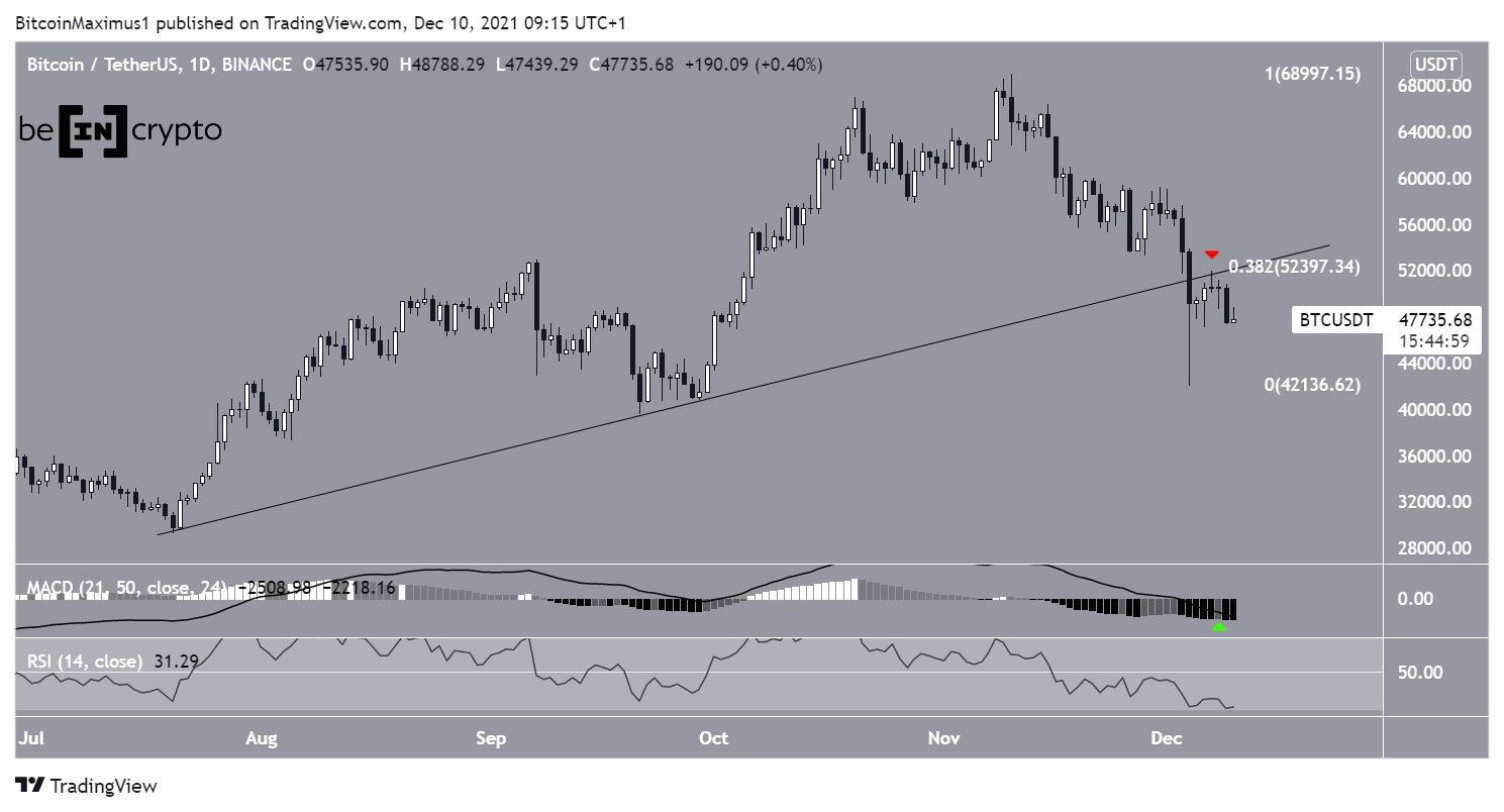 O Bitcoin está em queda desde terça-feira (7), quando atingiu um topo de US$ 51.936 (ícone vermelho). A alta foi feita muito perto do nível de retração de 0,382 de Fibonacci em US$ 52.400. Além disso, validou a linha anterior linha de tendência de alta como resistência. Os indicadores técnicos no gráfico diário são de baixa.