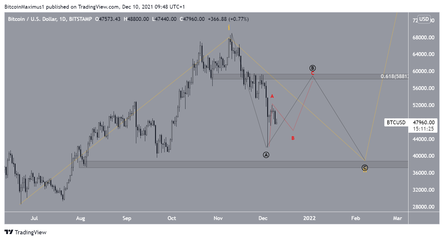 A contagem de ondas mais provável indica que a leve alta faz parte da sub-onda B (preta), de uma onda dois de longo prazo. Isso poderia levar o Bitcoin de volta à área de resistência de US$ 58.800, que é o nível de retração de 0,618 de Fibonacci. A contagem de sub-ondas menores é mostrada em vermelho.