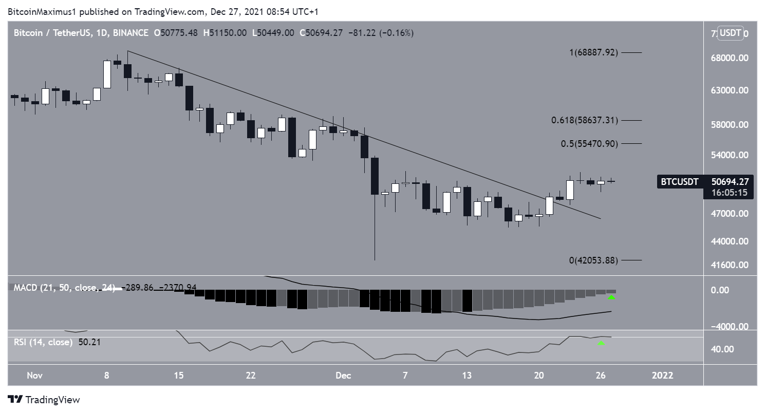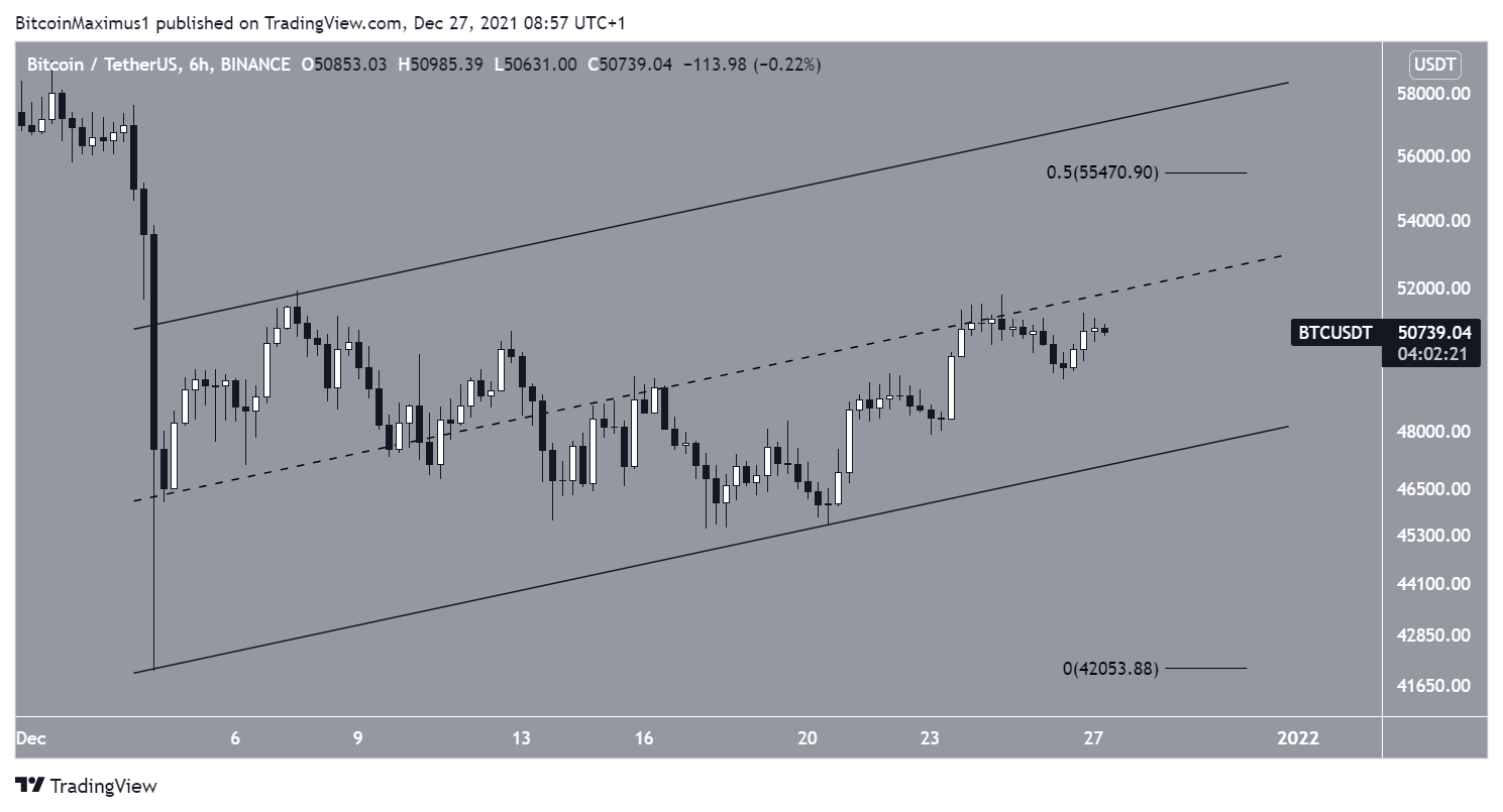 O gráfico de seis horas mostra que o BTC está sendo negociado dentro de um canal paralelo de alta desde a baixa de 4 de dezembro. Atualmente ele está sendo negociado na linha média do canal. A linha de resistência está próxima do nível de 0,5 de Fibonacci perto de US$ 55.500.