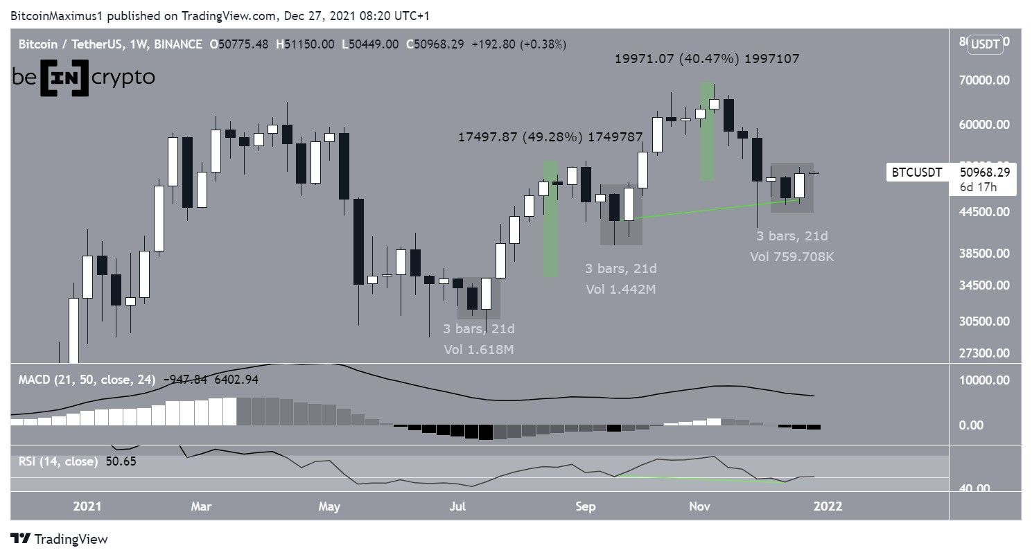 O Bitcoin subiu consideravelmente durante a semana de 19 a 26 de dezembro, chegando a US$ 50.775. Com isso, o ativo criou um candle engolfo de alta no gráfico semanal. Esse é um tipo de candle em que toda a queda anterior é anulada dentro do candle atual.