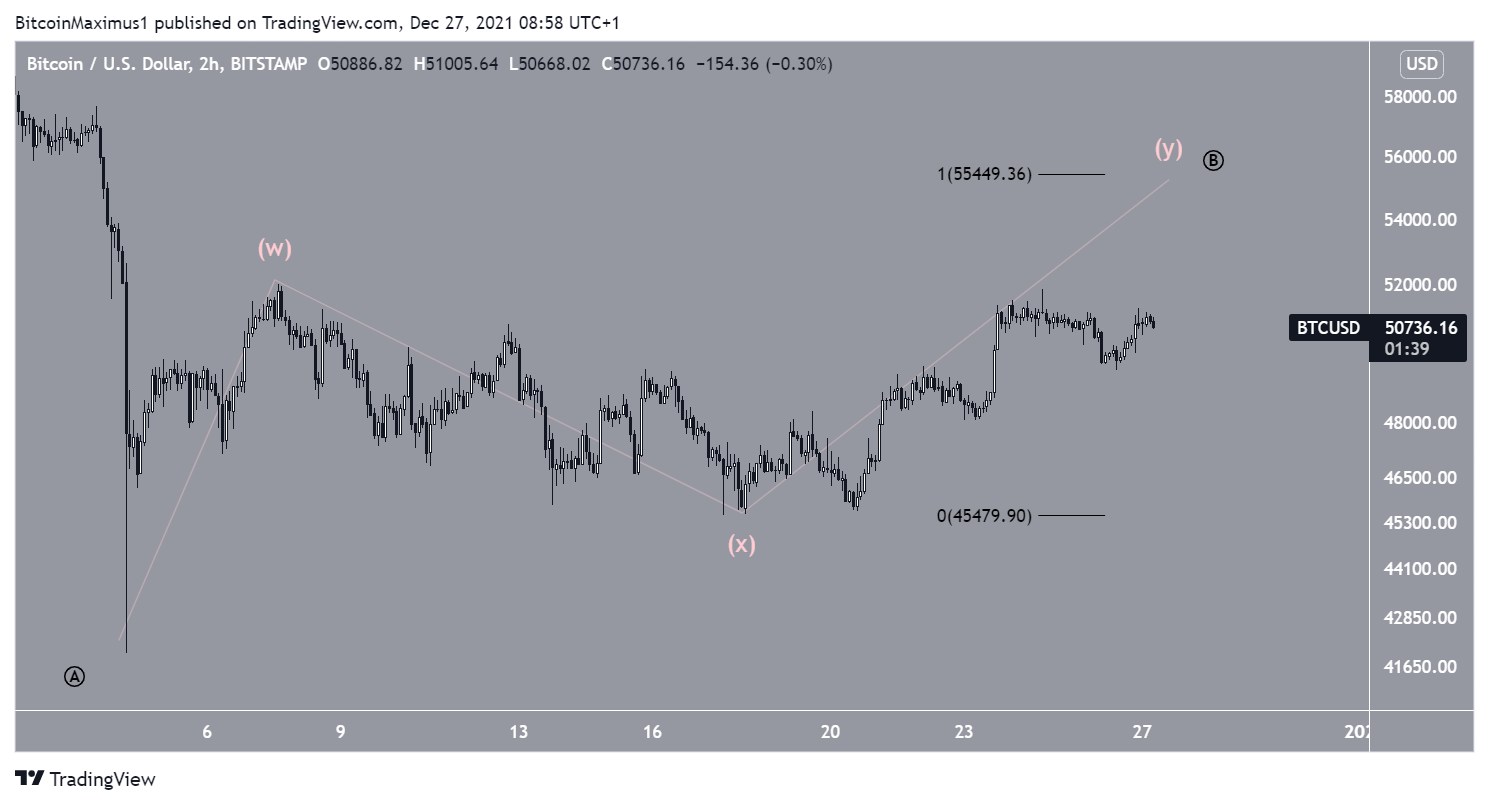 A contagem de ondas sugere que o Bitcoin está na onda Y de uma estrutura corretiva W-X-Y (rosa). Se as ondas W e Y tiverem uma proporção de 1: 1, o ativo pode atingir uma alta de US$ 55.450, perto da área de resistência anteriormente delineada. Todo esse movimento provavelmente completaria uma onda B de longo prazo (preto).