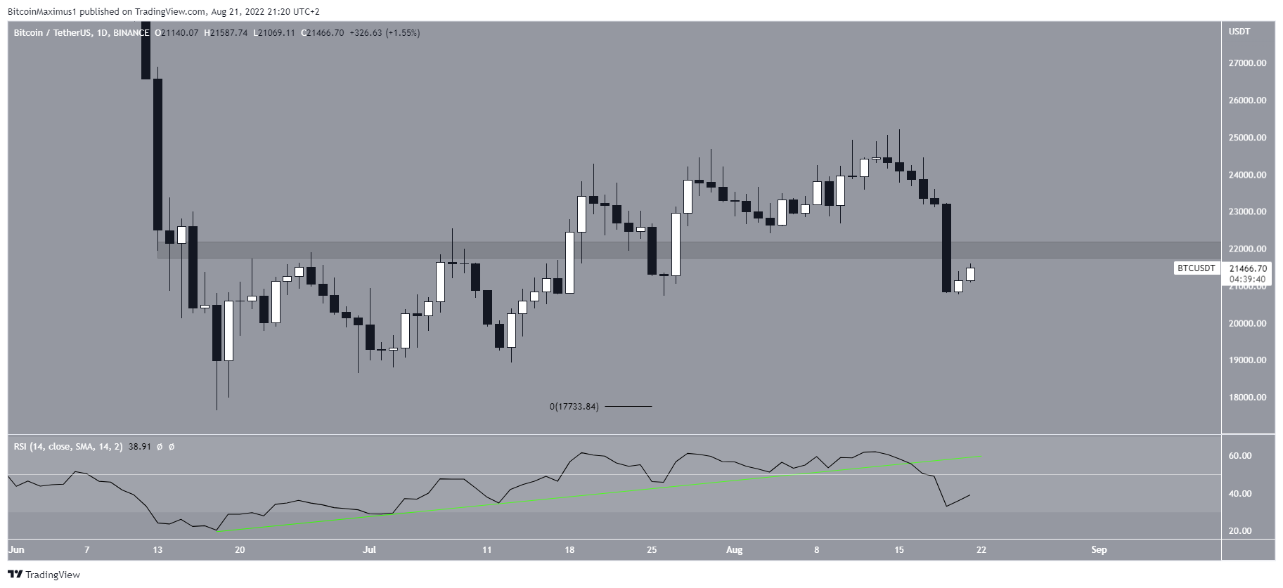 Além do mais, o preço caiu abaixo da área de US$ 22.000 depois de aparentemente romper acima dela. Espera-se agora que a área atue como resistência.