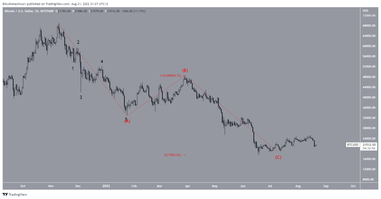 A contagem de ondas de longo prazo mais provável sugere que, a partir da máxima histórica, o Bitcoin completou uma estrutura corretiva A-B-C (vermelho). Nela, as ondas A e C tinham uma proporção de 1:1,61, que é a mais comum em tais estruturas.